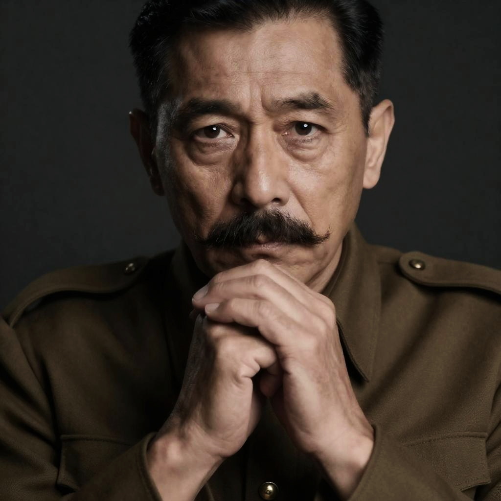Photograph of an older man with slicked-back gray hair, mustache, white shirt, black vest, and striped tie, holding a cigarette in his right hand. Red blinds with Japanese characters in the background. Intense facial expression.