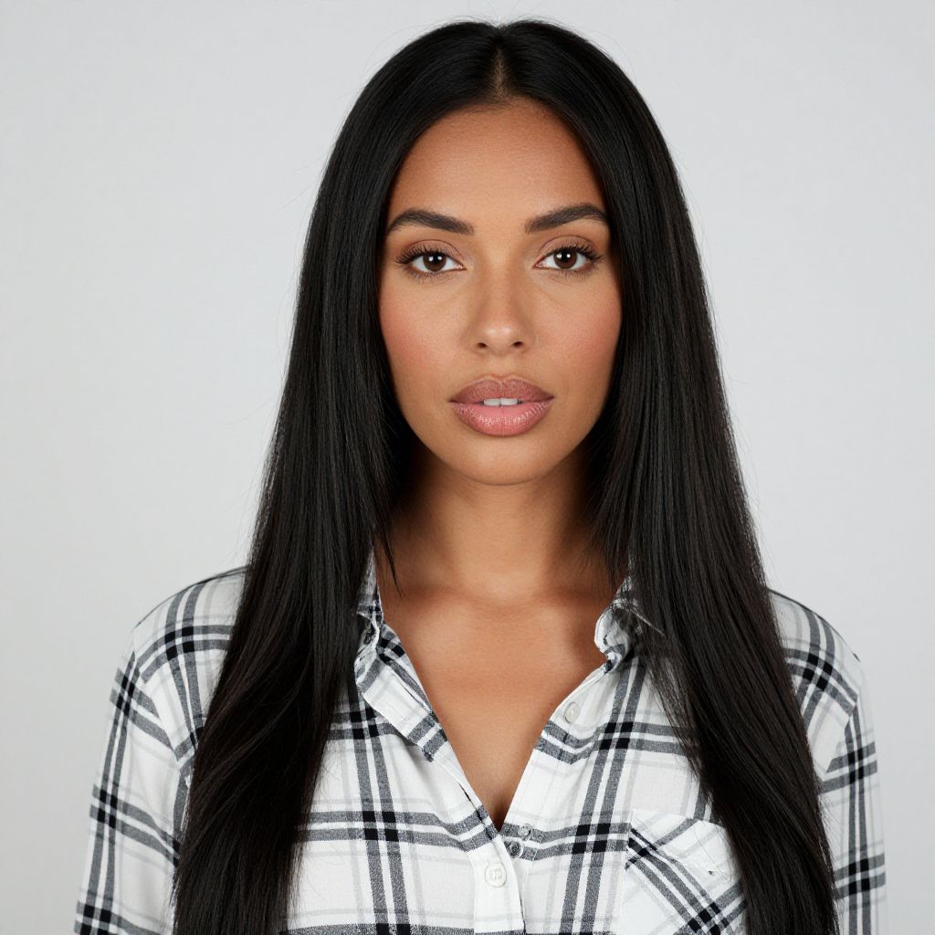 Photograph of a woman with long, straight black hair and medium brown skin. She's wearing a white and black plaid button-up shirt with the top buttons undone, revealing a hint of cleavage. She has full lips with a natural look and is looking directly at the camera with a neutral expression. The background is a plain, light gray color.