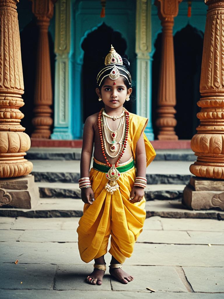 Child in Krishna Jayanthi Costume, photorealistic outdoor portrait in temple setting