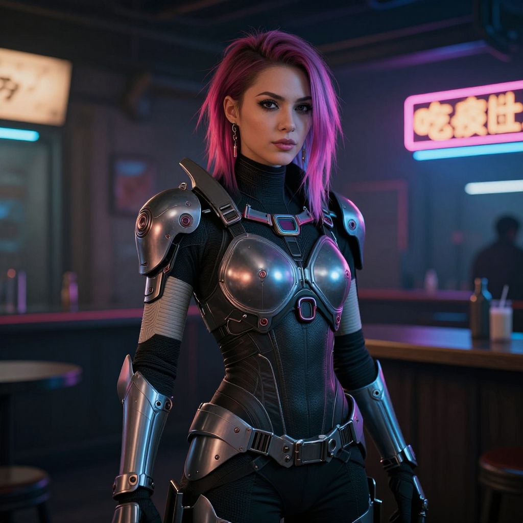 Photograph of a woman with pink-streaked hair standing in a dimly-lit bar. She wears a black, form-fitting bodysuit with metallic, futuristic armor plates on her shoulders, chest, and forearms. Her armor has silver accents and buckles. The background features neon signs with pink and blue lights, a bar counter with stools, and a blurry figure in the distance. The bar has a dark, industrial aesthetic with wooden textures. The woman's expression is serious and focused, and her makeup is subtle yet accentuates her features. The image has a cyberpunk, sci-fi vibe.