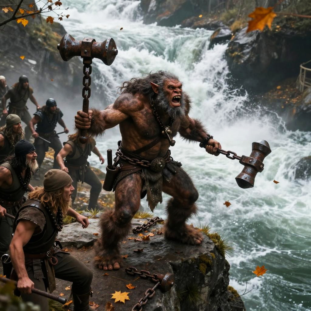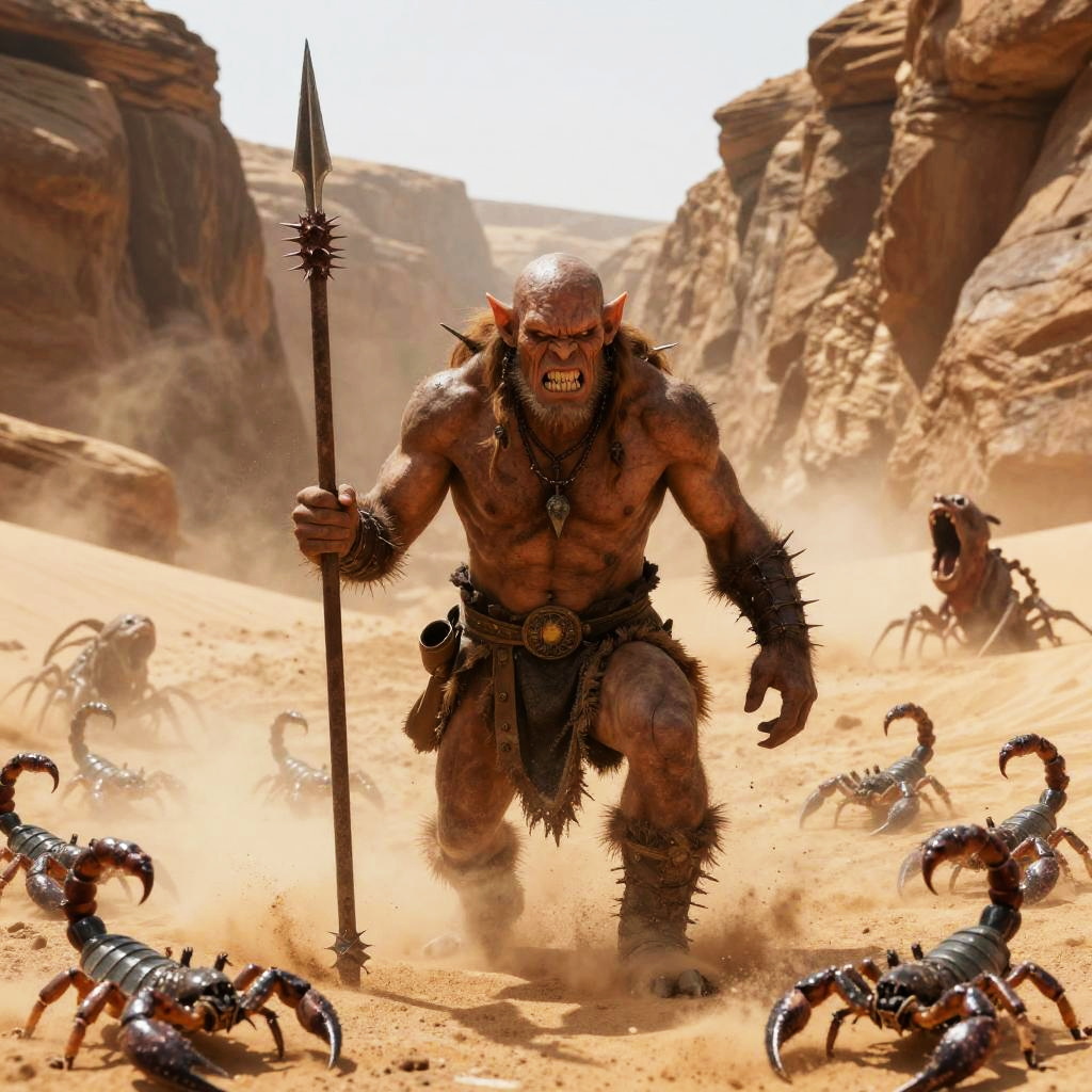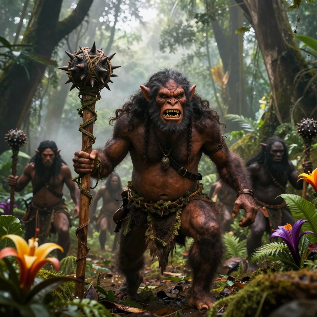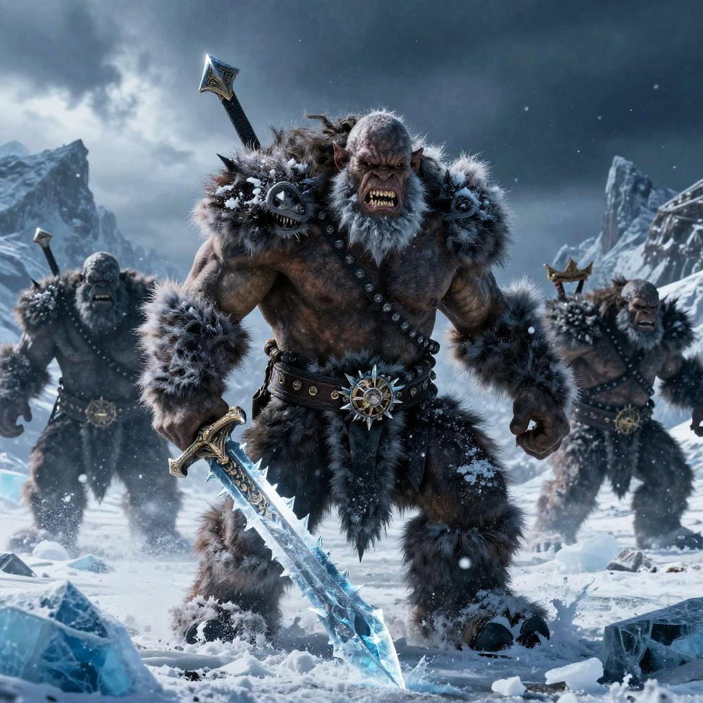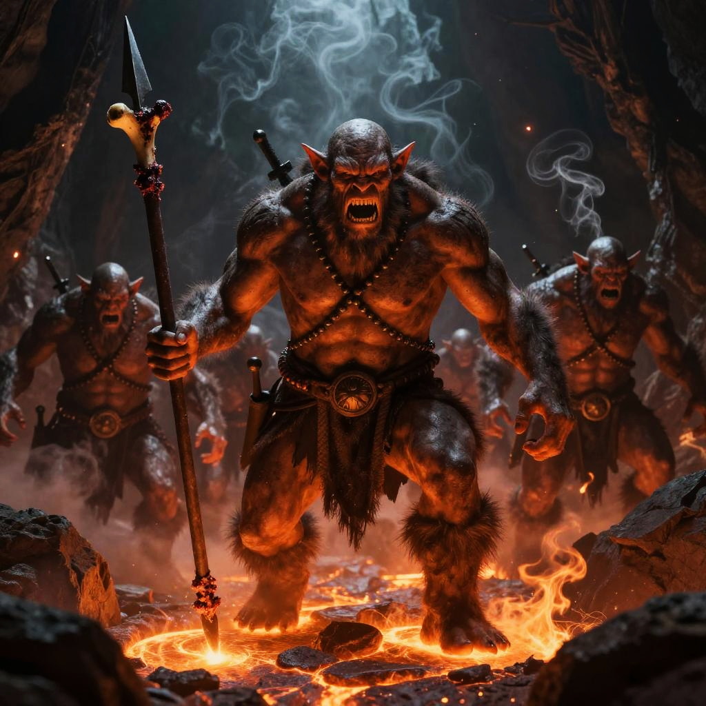 A fierce troll chieftain leading a pack of swift hill raiders, in a rugged highland plateau at sunset, holding lightweight curved short swords, energetic and cunning, with golden grasses swaying, distant vultures circling, epic and dramatic