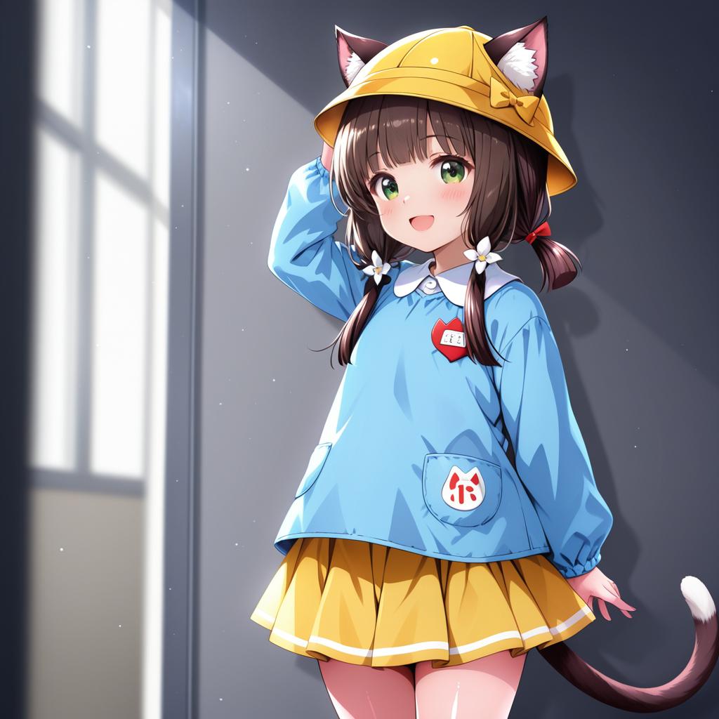 Mutsuki (azur lane), azur lane, 1girl, cat girl, cat ears, cat tail, fang, animal ear fluff, green eyes, brown hair, short hair, long hair, short twintails, blunt bangs, kindergarten uniform, school hat, kindergarten uniform, yellow headwear, blue shirt, yellow skirt, by artist hajin, anime