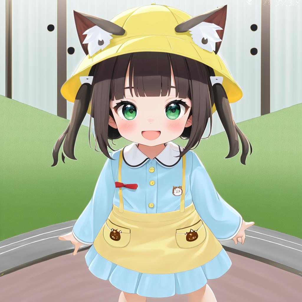 This is a digital anime-style drawing of a cute young girl with green eyes and black twin-tails. She wears a yellow hat with brown and white cat ears, a light blue long-sleeve shirt with a white collar, and a yellow apron with brown paw prints. She has a small red bow on her shirt and stands on a gray path with green grass on either side. The background features tall vertical white and black patterns. She smiles warmly with an open mouth, exuding a cheerful and innocent demeanor. The image is colorful and vibrant, with clean lines and a soft, pastel palette.