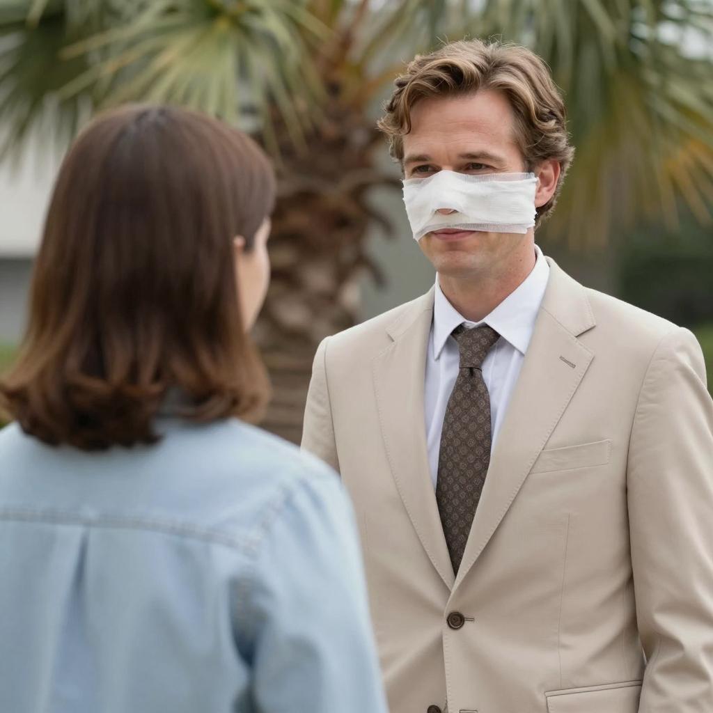 Man with a white bandage over his nose, wearing a brown fedora, aviator sunglasses, beige suit, white shirt, and patterned tie. Background: orange tree with yellow oranges. Man's face has a neutral expression, slightly furrowed brows. Upper body shown, leaning back slightly. Natural light.