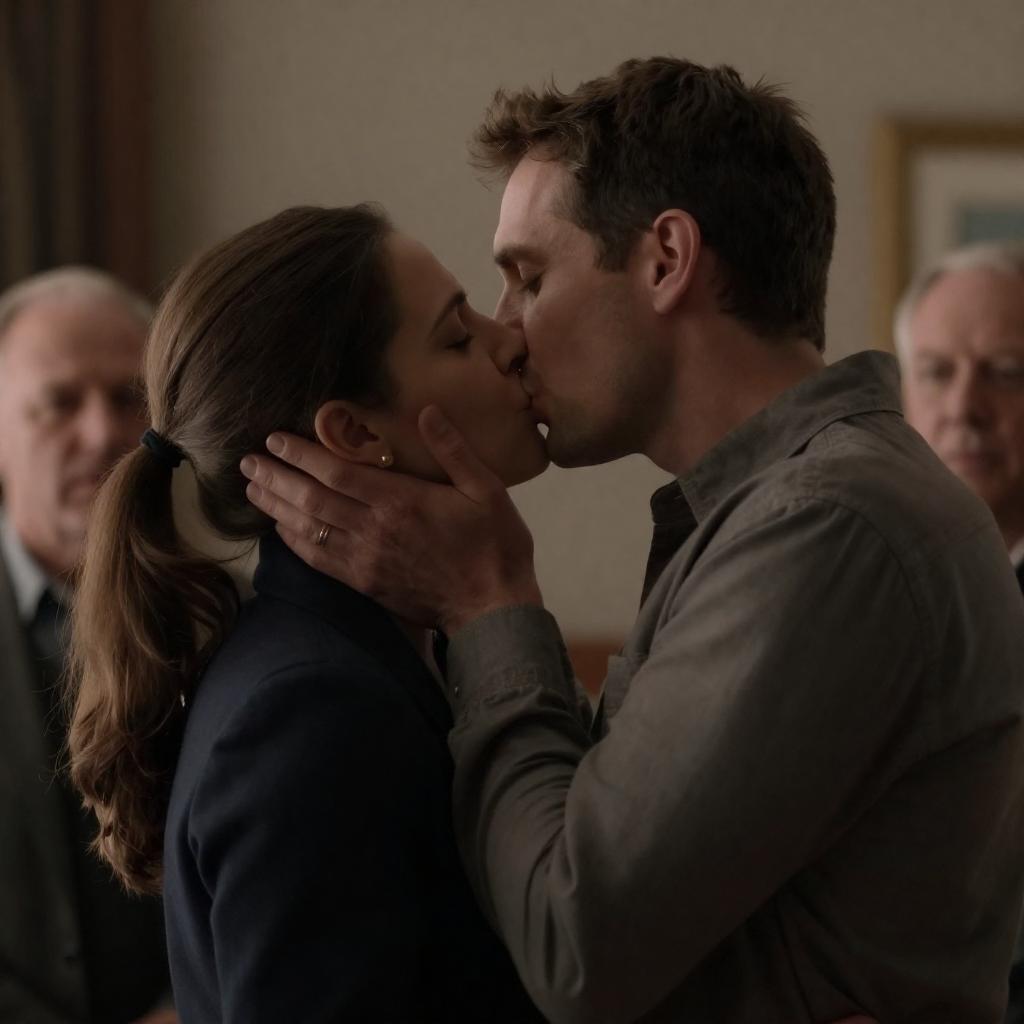 Photograph of a man and woman kissing passionately. The man, with short brown hair, holds the woman's face with his left hand. The woman has long brown hair in a ponytail, wearing a dark jacket. Two older men in the blurred background. Dimly lit indoor setting.