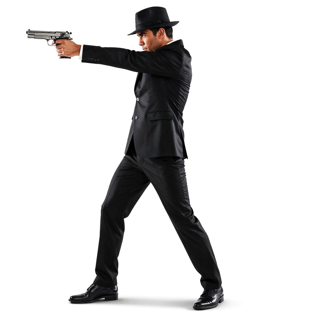 Photograph of a man with short dark hair, wearing a black t-shirt and black pants, mid-action pose, aiming a gun with his right hand. He's slightly crouched with his left arm extended backward and his right leg bent forward. The background is entirely white, making the man and his pose stand out prominently. The image has a dynamic, action-packed feel.