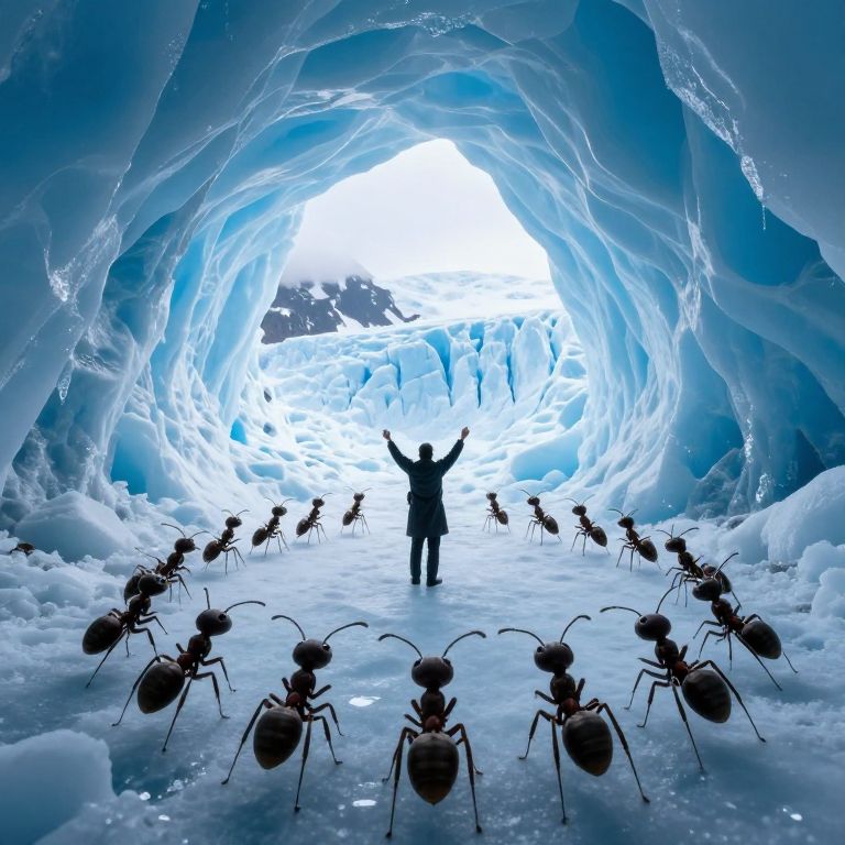 In a surreal symphony of resilience and wonder, ants and humans converge beneath a glacier, their harmonious melodies echoing through the icy caverns, weaving a tapestry of unity amidst the cold embrace of eternity.