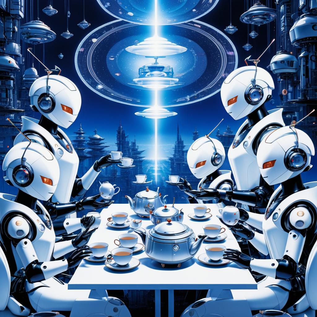 Anime-style illustration of four futuristic robots enjoying a tea party at a round white table. The robots have sleek white and black designs with red and blue accents, featuring rounded helmets and antennae. The setting is vibrant with a large orange sun and green circular background, and futuristic spacecraft are visible in the sky. The table is set with teapots, teacups, and a dessert bowl, blending traditional tea party elements with advanced robotic figures.