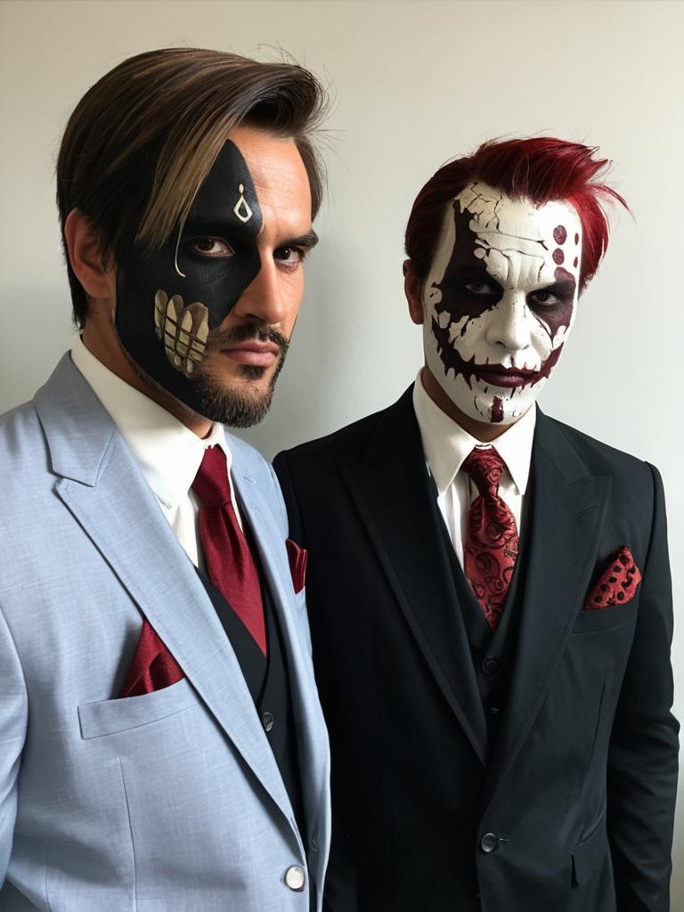 Two men dressed in sharp suits with detailed Two-Face inspired face paint makeup. One man wears a light grey suit with burgundy tie and pocket square, featuring a black and gold face paint design. The other wears a black suit with patterned red tie and pocket square, makeup mimicking cracked white and black Joker-like features with red accents. Both have intense expressions against a plain white background.
