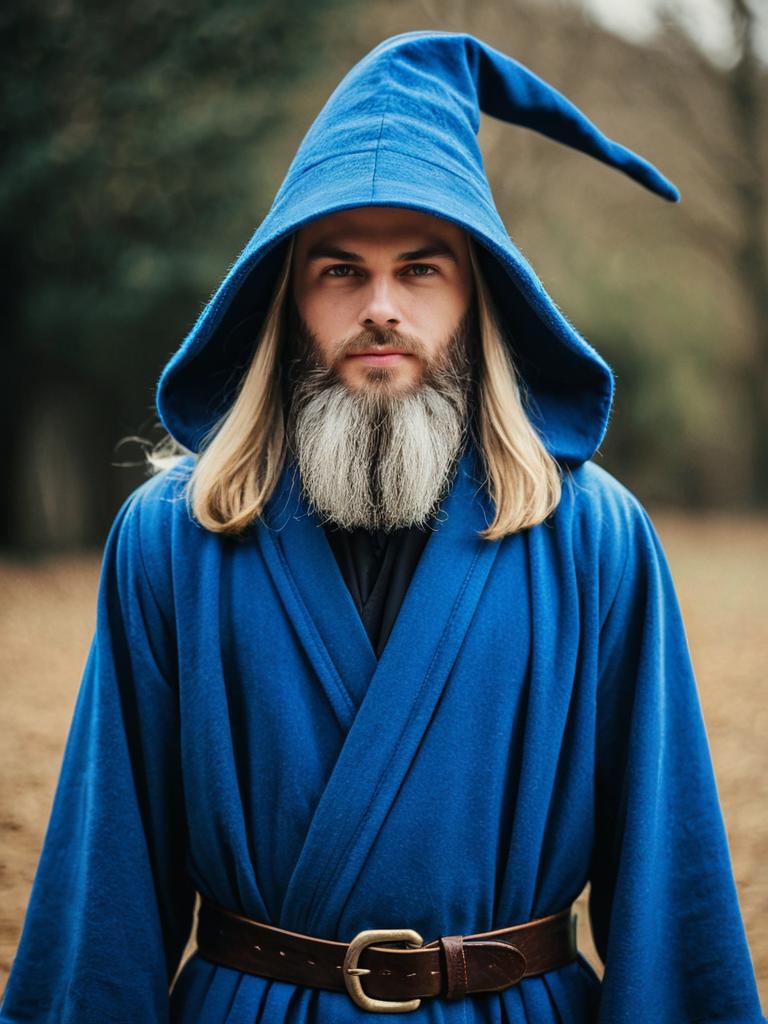 Portrait of a man with long blonde hair and a full grey beard wearing a blue wizard robe and pointed hooded hat. He has blue eyes and stands outdoors against a blurred natural background. The robe is belted at the waist with a brown leather belt.