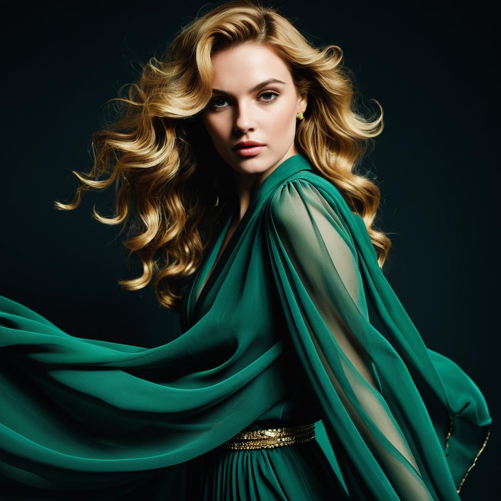 A glamorous fashion portrait of a woman with wavy brown hair and dramatic makeup, wearing luxurious emerald velvet fabric that flows around her, elegant pose in a studio setting with high contrast lighting and smooth skin texture, soft focus creating a vintage fashion magazine look