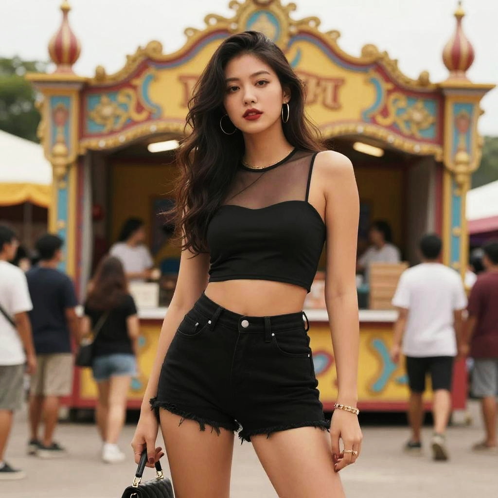 This vibrant image showcases a confident woman posing in a brightly colored urban alleyway, highlighted by neon lights and graffiti art. Her stylish outfit features a shimmering, multicolored top that captures the essence of contemporary street fashion, making it a perfect representation of modern urban culture.