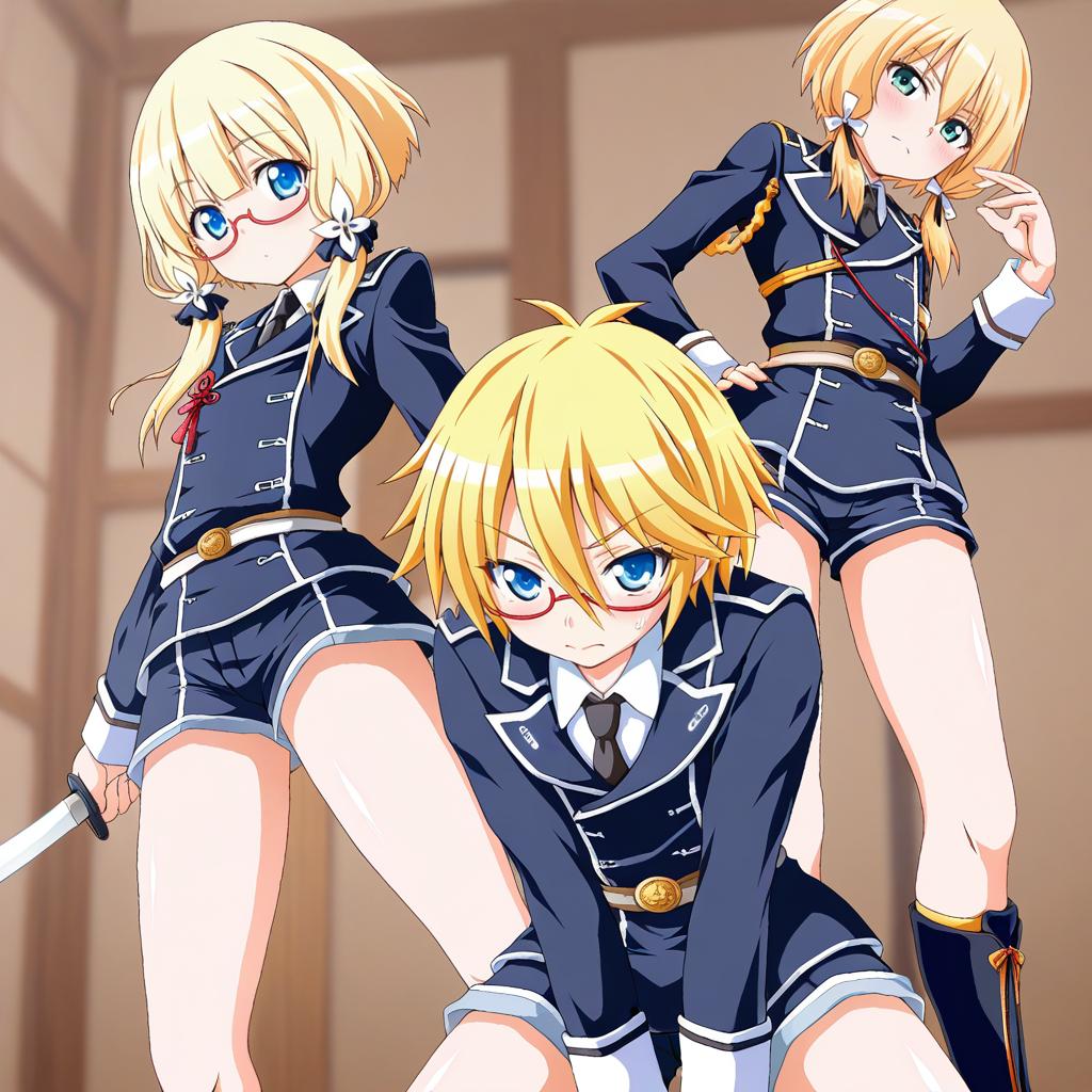 Anime-style illustration of Hakata Toushirou from Touken Ranbu, featuring a boy with blue eyes, blonde hair, and red-framed glasses. He is wearing a detailed dark blue military uniform with white trim, a necktie, and shorts, holding a braided cord. The artwork highlights multiple views of the character, with a focus on his determined expression in the foreground. Created by artist Kuroi Mimei in Animagine style.