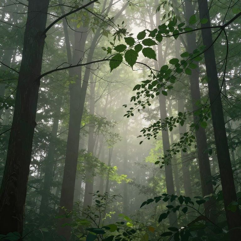 Stable diffusion canny applied to a serene forest scene, morning mist weaving through tall trees, emphasized leaf and branch outlines, soft natural light filtering through foliage, painterly effect with clear edge contrasts, calm and peaceful atmosphere.