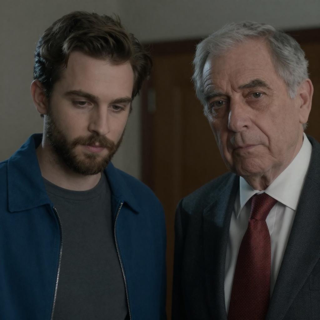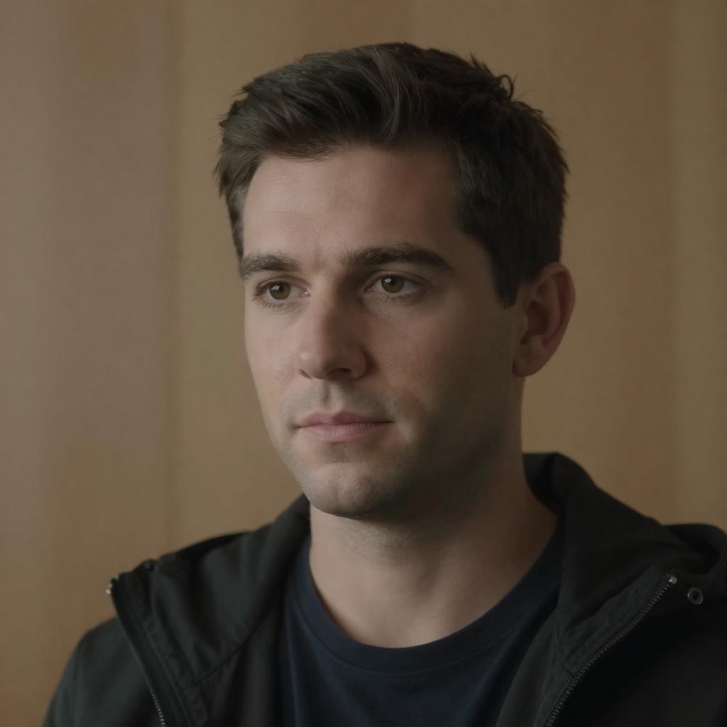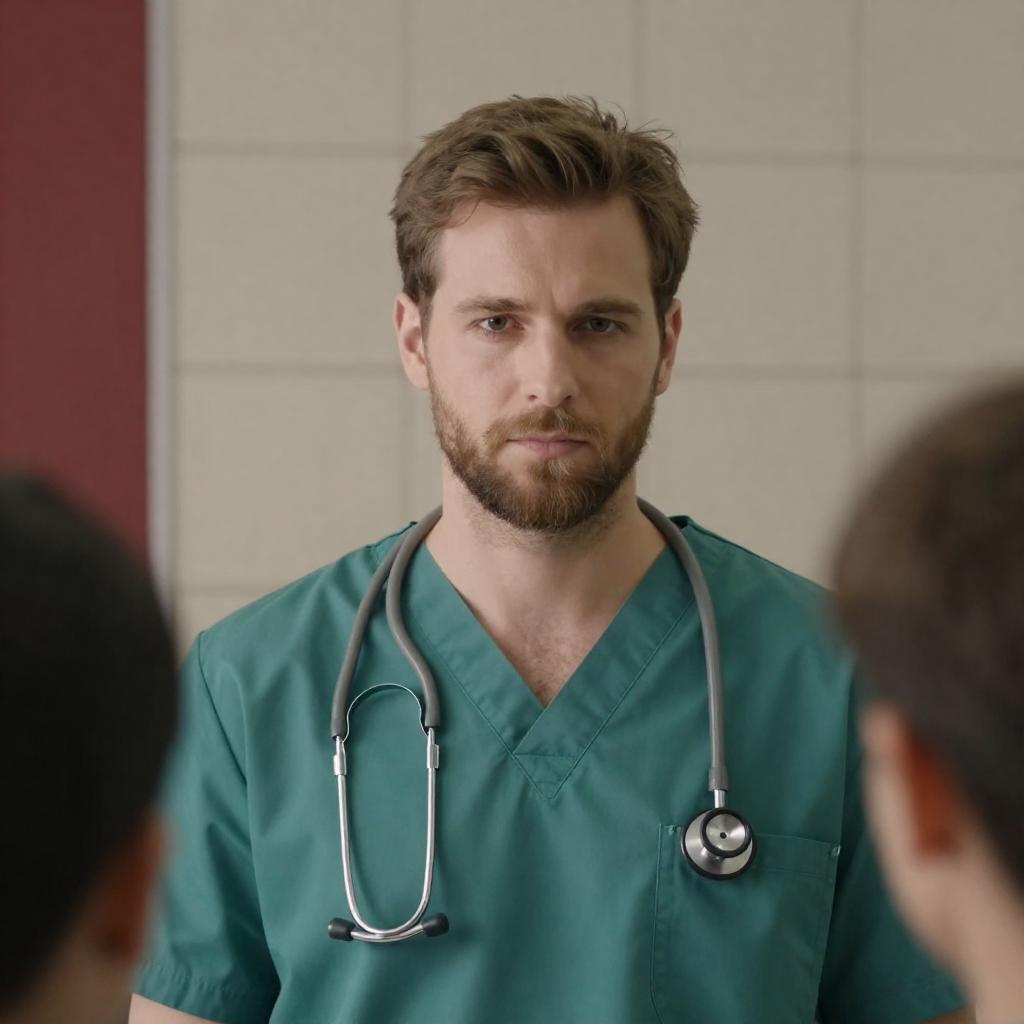 Photograph of a male doctor with short brown hair and light beard, wearing green scrubs and stethoscope, looking serious. Background has beige tiled walls. Foreground shows blurred dark-haired person. Doctor's left eye slightly squinted. Red wall on left.