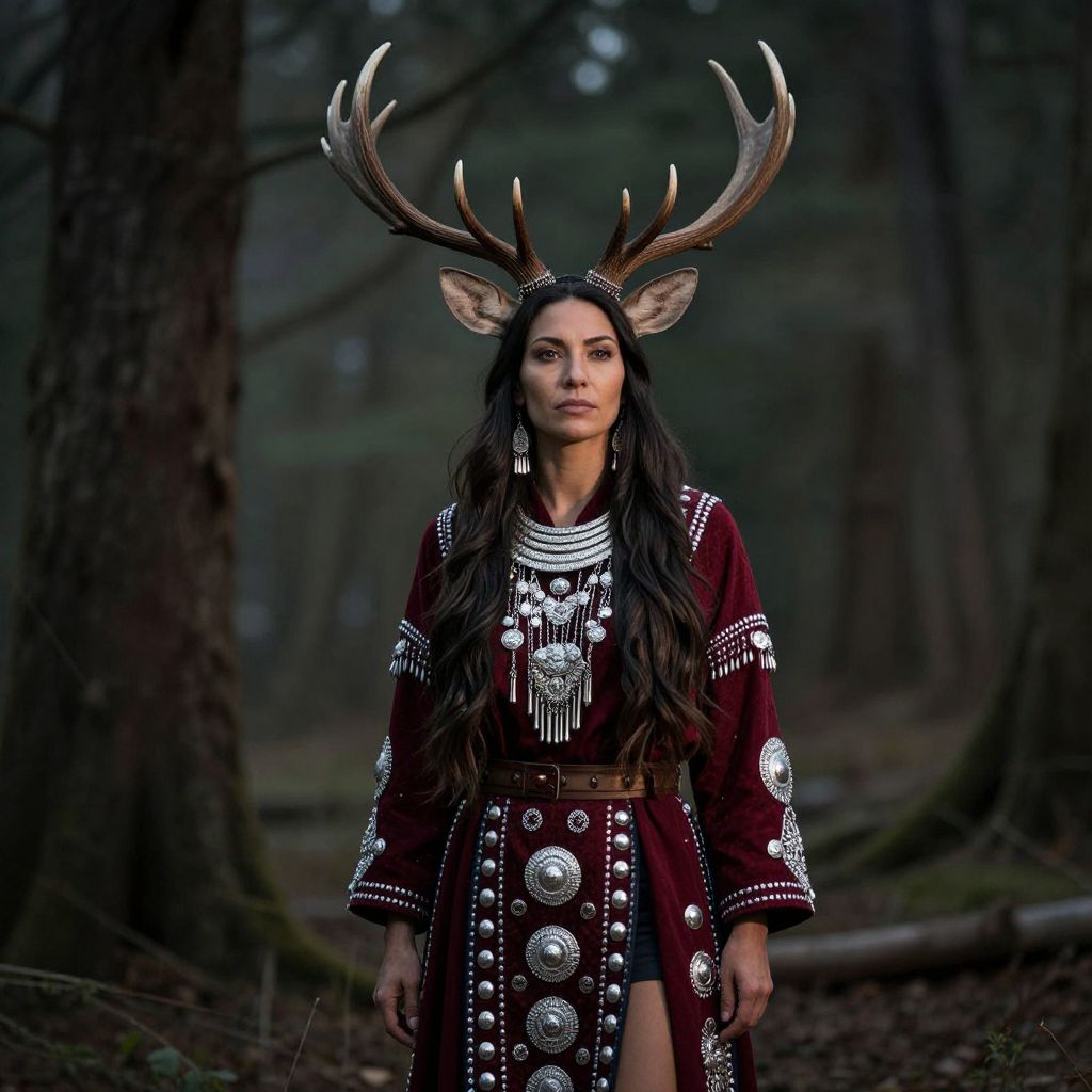 Majestic Deer Woman stands poised in a mystical forest, her dark hair cascading down her shoulders as she wears ornate antlers atop her head, a deep red garment adorned with intricate silver embellishments draped around her form, embodying the spirit protector of Native American lore.