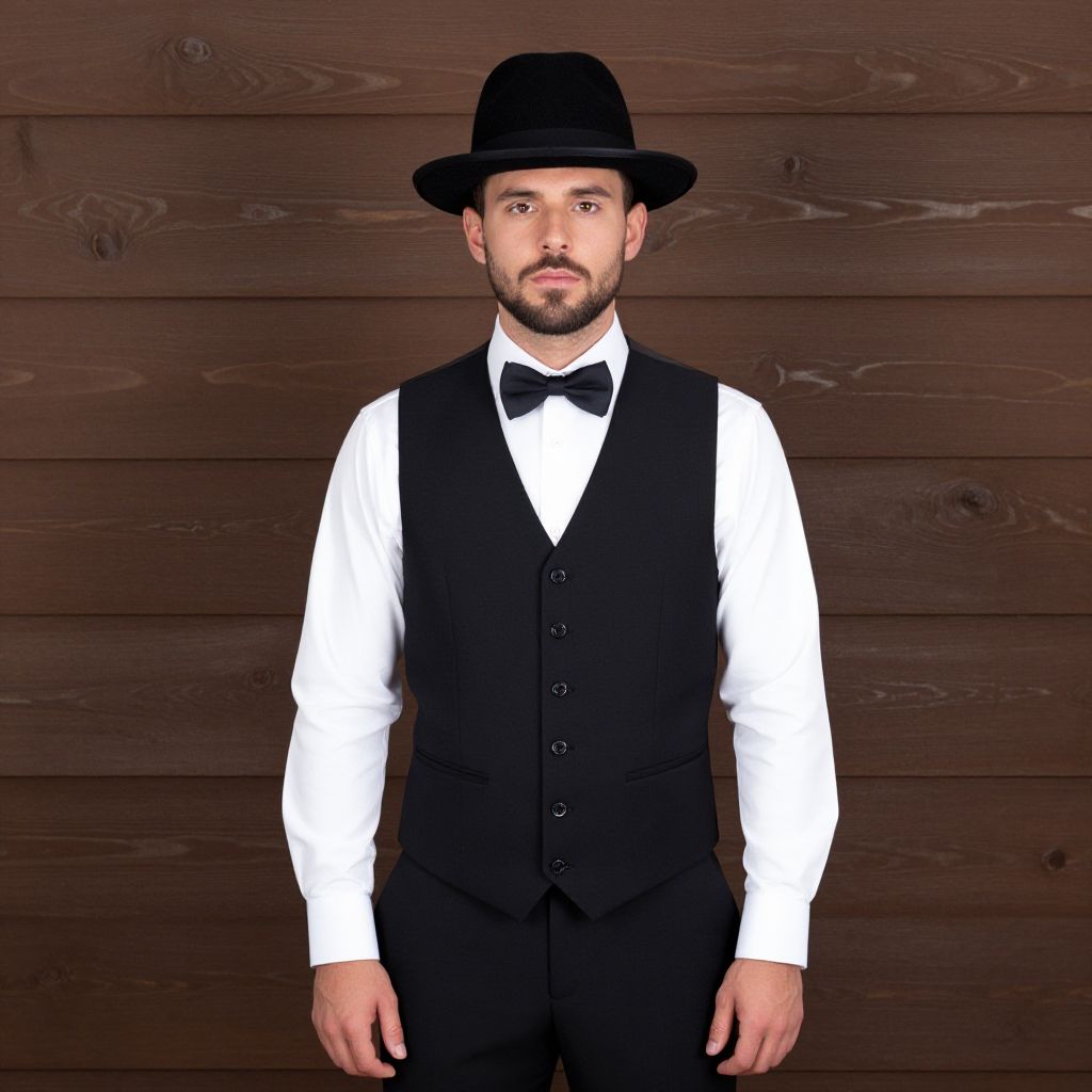 "Western Formal Wear Male Costume, man wearing a hat and vest standing in front of a wooden wall"