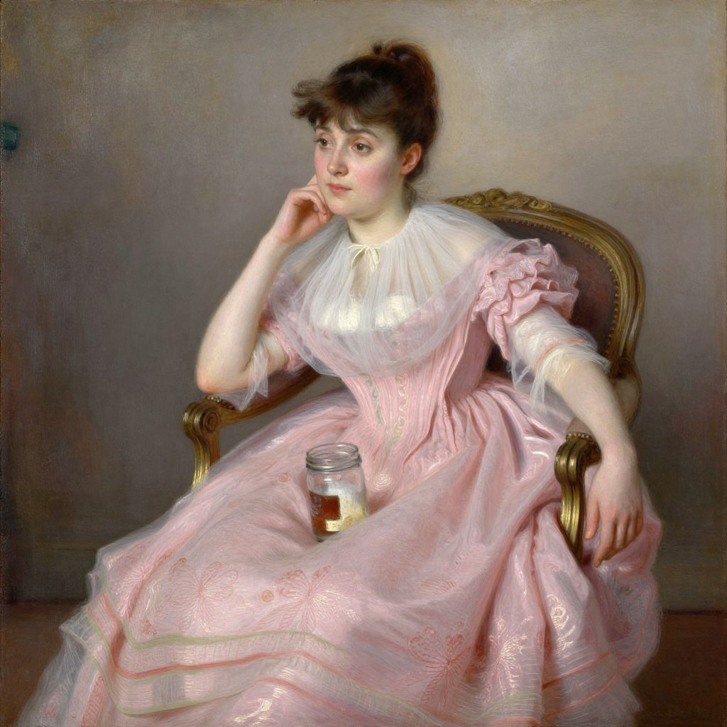 Victorian-era painting of a fair-skinned woman with dark hair in a pink, lace-trimmed dress, seated on an ornate chair,