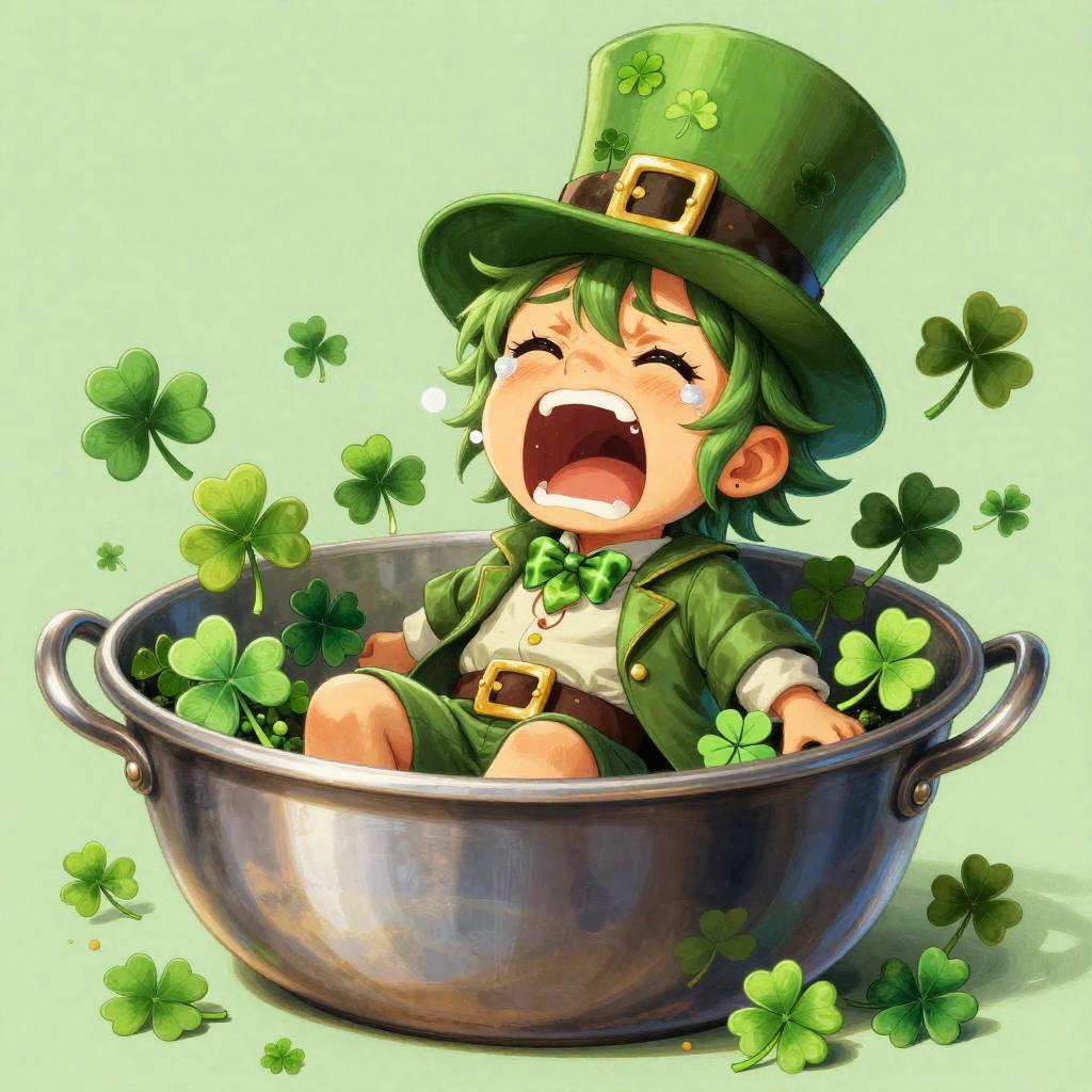 Empty pot, screaming, open mouth, crying with eyes open, green hair, leprechaun, anime, drawn, dressed as a (leprechaun:1.2), (shamrocks, clovers:1.2), lucky charms, green clothing, green jacket and green shorts and a green hat, green background, (masterpiece), (detailed), (intricate details), (realistic, photo-realistic:1.37), illustration, an extremely delicate and beautiful, 8k wallpaper, absurdres, incredibly absurdres, ultra-detailed, highres, extremely detailed