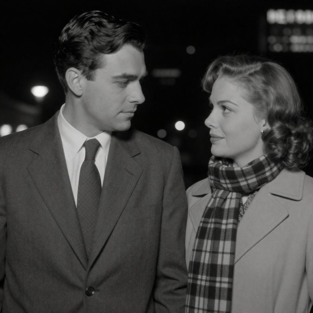 Black and white photograph of a man and woman dressed in 1930s-style clothing. The man is wearing a dark suit with a striped tie and a black fedora hat, looking intently at the woman. The woman wears a fur coat, a dark hat adorned with a flower, and a pearl necklace, looking back at the man with an intense expression. The background is indoors and slightly blurred, featuring indistinct objects.