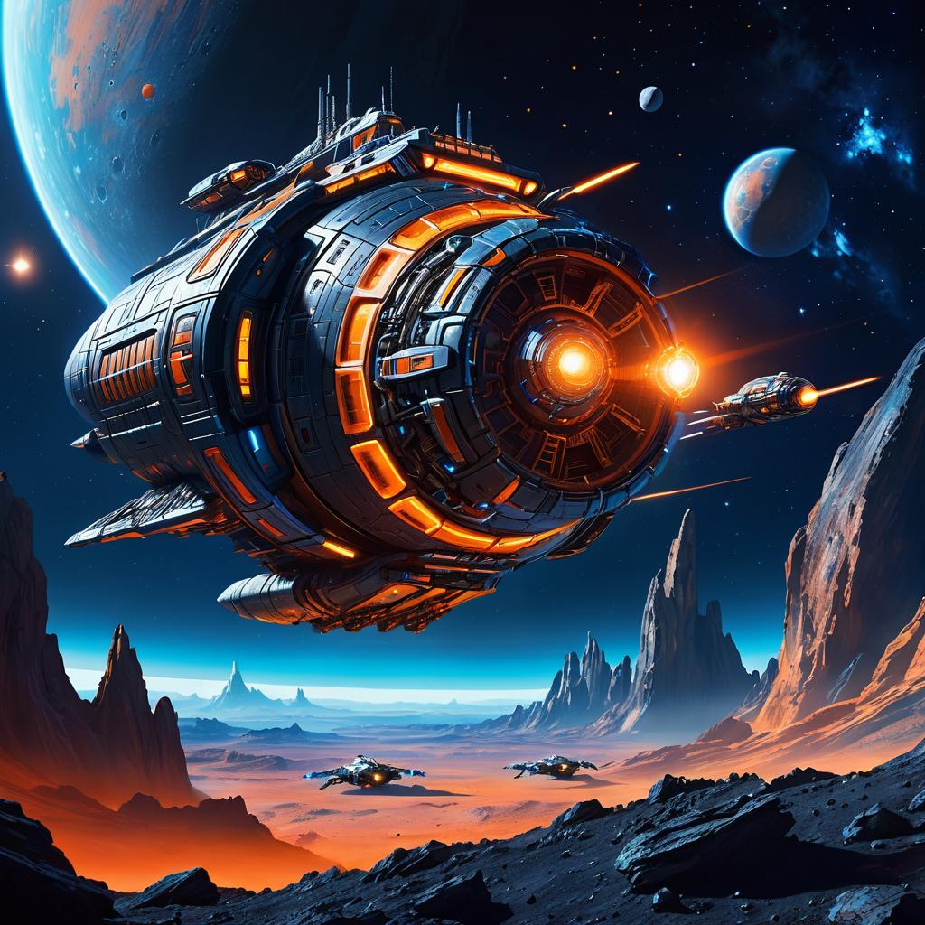 A detailed sci-fi spaceship with intricate machinery and dark metallic textures is hovering over a rocky planetary surface in outer space. The spaceship engine glows with a bright orange light, contrasting with the cold blue hues of the distant planet and the stars in the background. Cinematic lighting highlights the realistic and futuristic design of the spacecraft, creating a dramatic and immersive outer space scene.