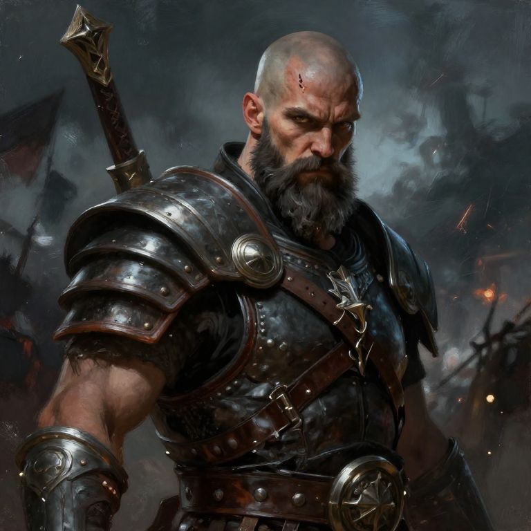 Photorealistic digital artwork of a muscular, bald, bearded man in dark, metallic armor with intricate designs and rivets. He has a serious expression, with a scar on his left cheek. His armor includes shoulder plates, a chest plate, and a sword sheath on his back. The background is a dark, smoky battlefield with glowing embers and silhouettes of other armored figures. The lighting highlights the shiny texture of his armor, contrasting with the shadowy, chaotic background. The overall mood is intense and battle-ready.