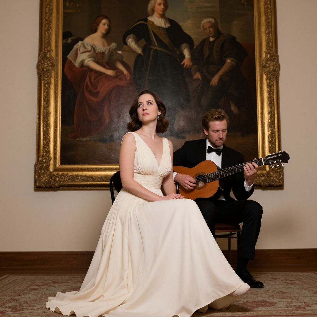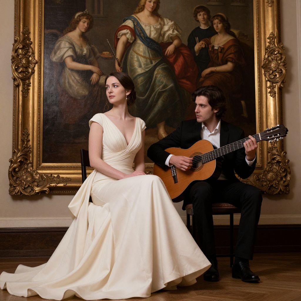 Woman sits gracefully in a cream gown, her gaze captivated by the musician's performance as he strums a guitar, framed by a grand, ornate portrait of a group behind them.