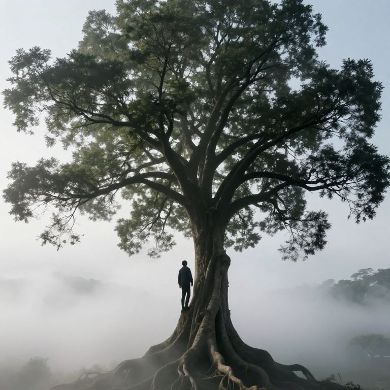 Photograph of a large, majestic tree with sprawling branches and dense, green leaves silhouetted against a bright, misty background. A solitary figure stands at the base of the tree, facing upward, dressed in dark, casual clothing. The tree's thick, twisted roots extend out from the ground, creating a textured, earthy base. Mist gently envelops the lower part of the image, adding a sense of serenity and mystique. The overall composition emphasizes the tree's grandeur and the smallness of the human figure in comparison. The light is soft, highlighting the tree's silhouette and the mist.