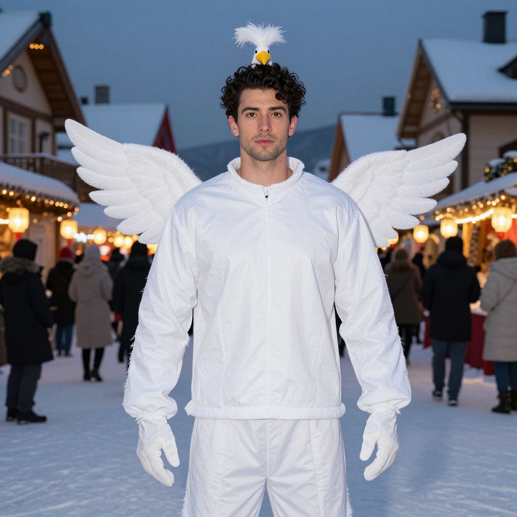 A tall, athletic man in his early 30s with sharp facial features, defined jawline, and dark curly hair dons a full white dove costume during a winter festival, standing in a snowy village square with frosty decorations and glowing lanterns, the costume made of lightweight fabric with realistic feather details