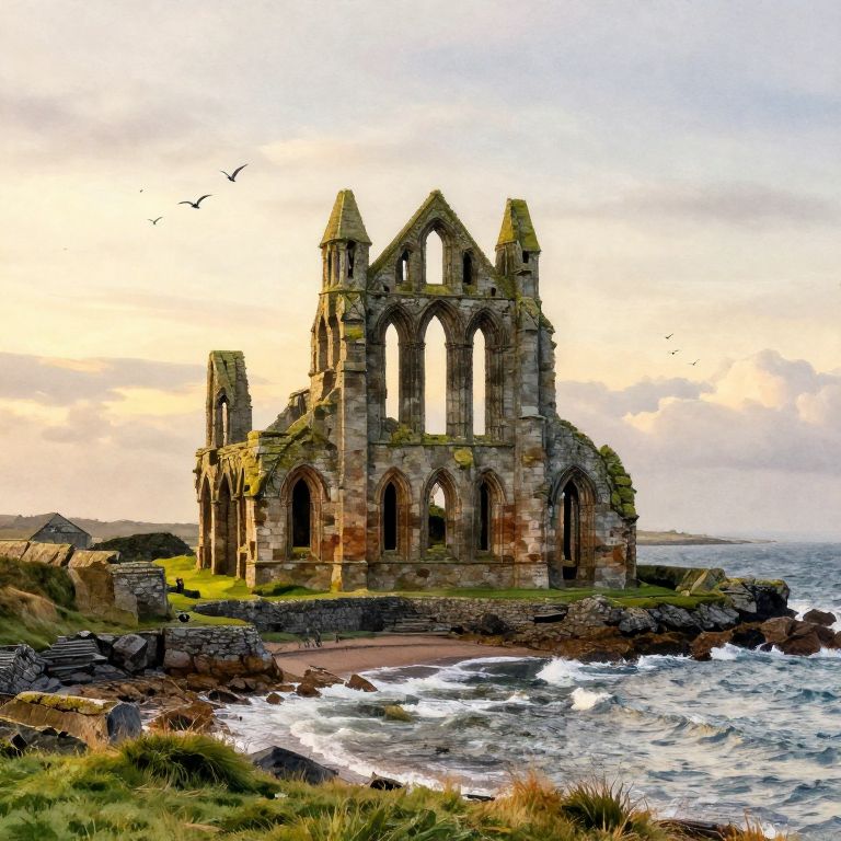 Lindisfarne medieval monastery ruins at golden sunset, serene coastal landscape with gentle waves, ancient stone architecture covered in moss, birds flying above, mystical atmosphere, detailed textures, soft warm light, realistic watercolor style