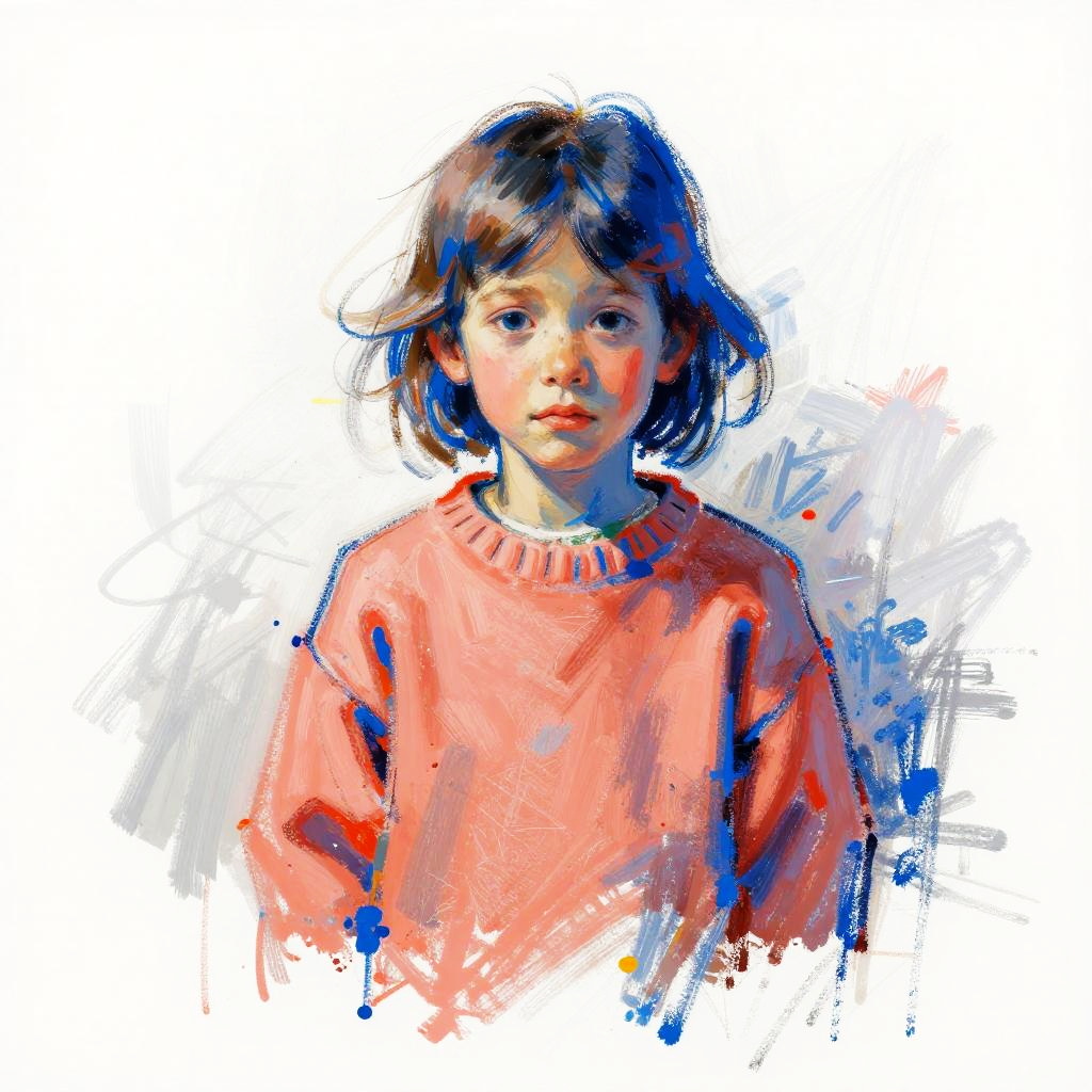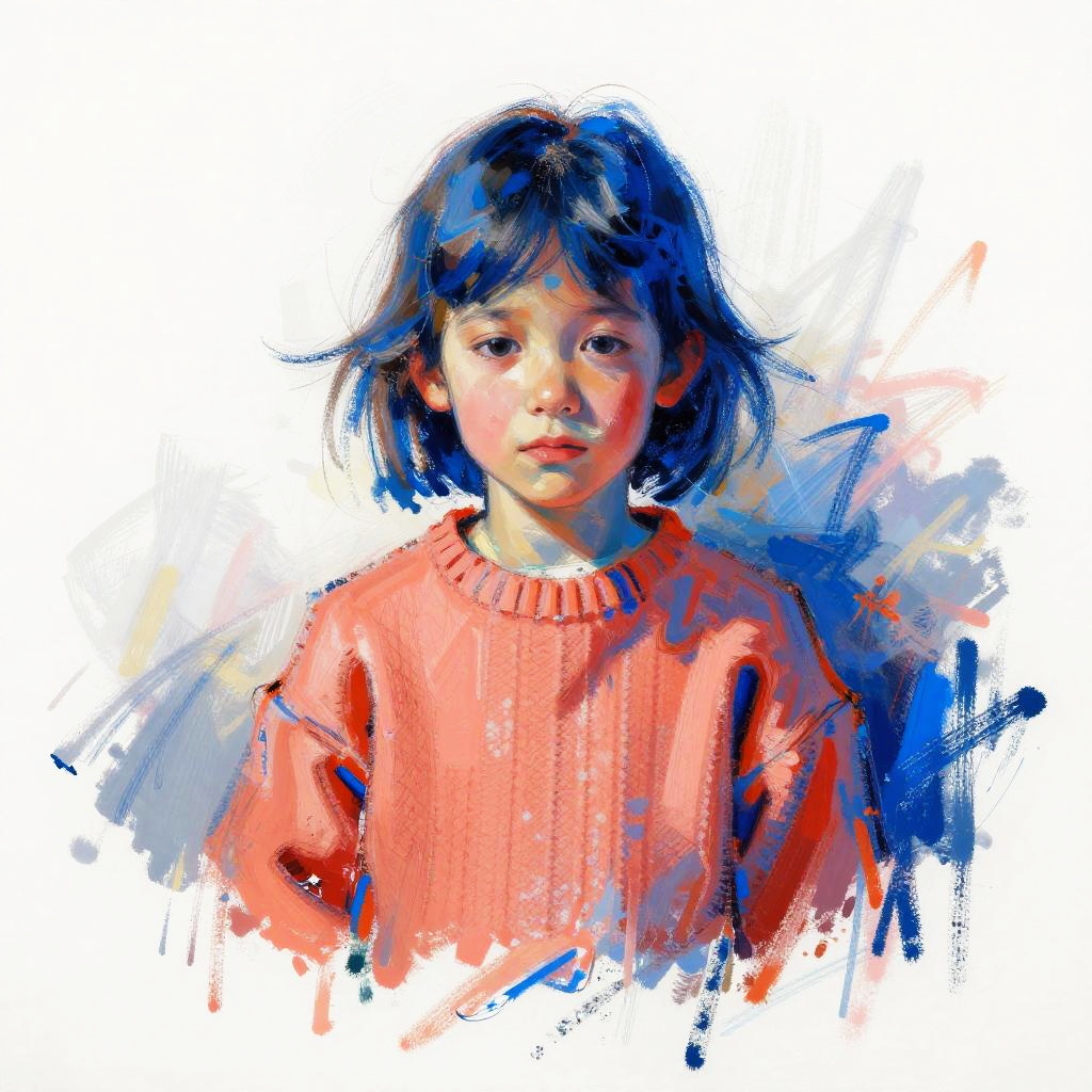 Expressionist semi-abstract portrait of dispersed child outlining coral sweater with jagged cobalt limbs, rendered in expressionist pastel with rough crosshatching and textured dabs, high-contrast bold colors, loose gestural strokes and textured paint ridges, minimal white negative space with asymmetrical crop, cobalt-shadow accents and suggestive contours, emotive hopeful innocence diffused by silent sorrow, contemporary art poster vibe, painterly chaos with subtle drips, unresolved edges, luminous highlights.