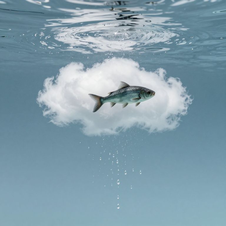 Photograph of a silver fish with a slightly blue tint swimming within a small, white, fluffy cloud floating in a vast, clear blue underwater scene. The fish is positioned slightly to the right of the cloud, with water droplets trailing from the cloud's bottom. The water's surface is visible at the top, creating ripples and reflections, adding a sense of depth and movement. The image combines surreal elements with realistic underwater textures.