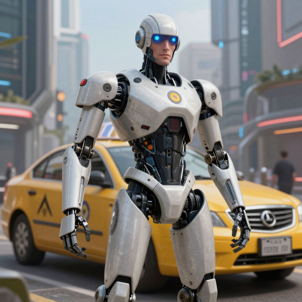Photorealistic CGI image of a futuristic, white humanoid robot standing in a bustling city street. The robot has sleek, metallic armor with blue glowing eyes and a circular emblem on its chest. Its design features detailed joints and panels, giving a high-tech appearance. In the background, a yellow taxi with a black roof light is driving past, with blurred neon lights and tall buildings lining the street. The scene is set during daylight, with a clear blue sky. The robot's stance is confident, with arms slightly bent and legs apart.