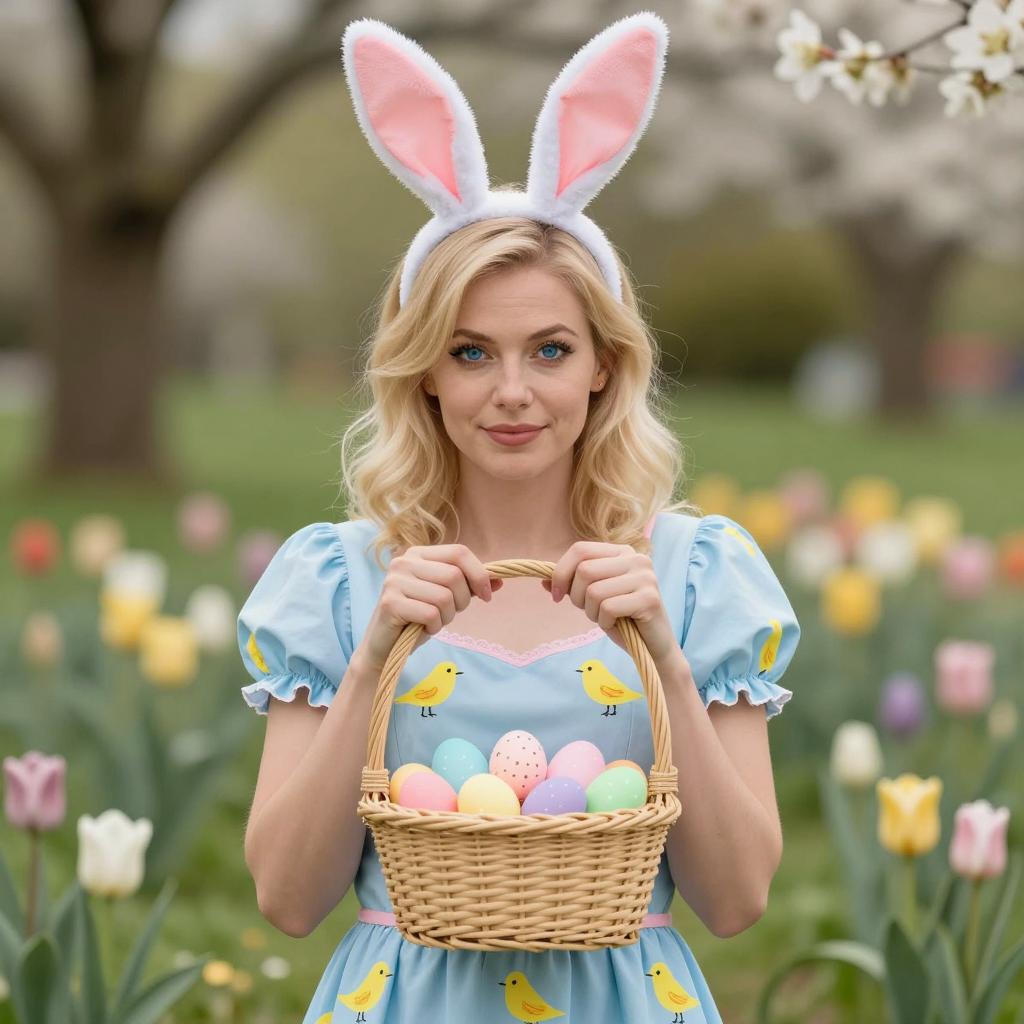 Portrait of a blonde woman with blue eyes wearing a light blue dress adorned with yellow bird patterns and a pink headband with white bunny ears. She is holding a wicker basket filled with colorful pastel Easter eggs, standing outdoors in a spring garden with a blurred background of blooming tulips and green grass. The image features soft natural lighting and pastel tones, capturing a gentle, festive atmosphere.