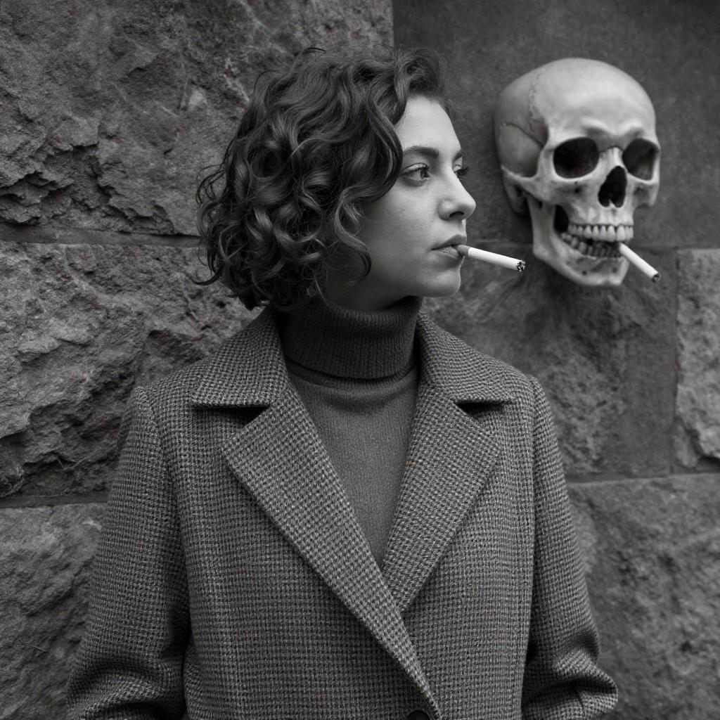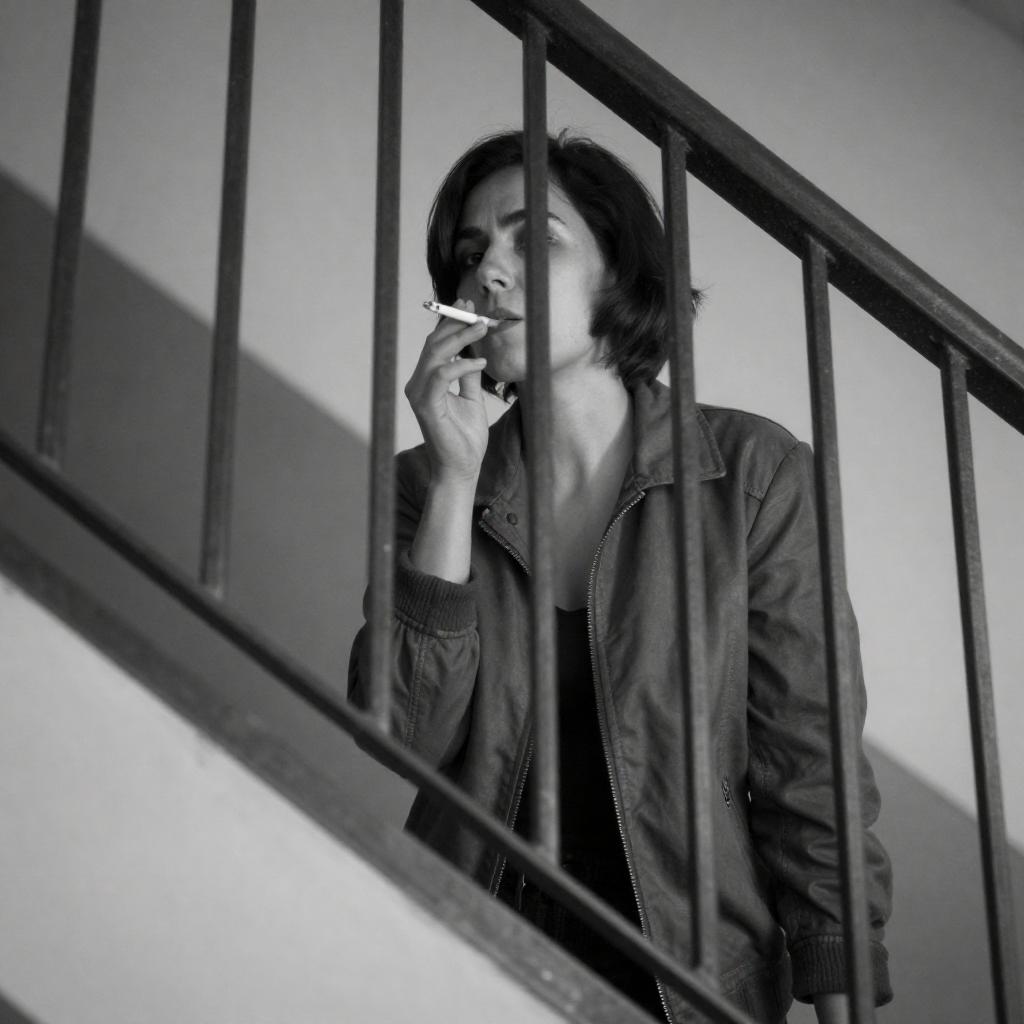Black-and-white photograph of a woman with short dark hair, wearing a ured jacket, peering through vertical metal bars of a staircase railing. She holds a cigarette to her mouth with her right hand, her expression intense and focused. The staircase and railing create a diagonal pattern, adding depth to the image.