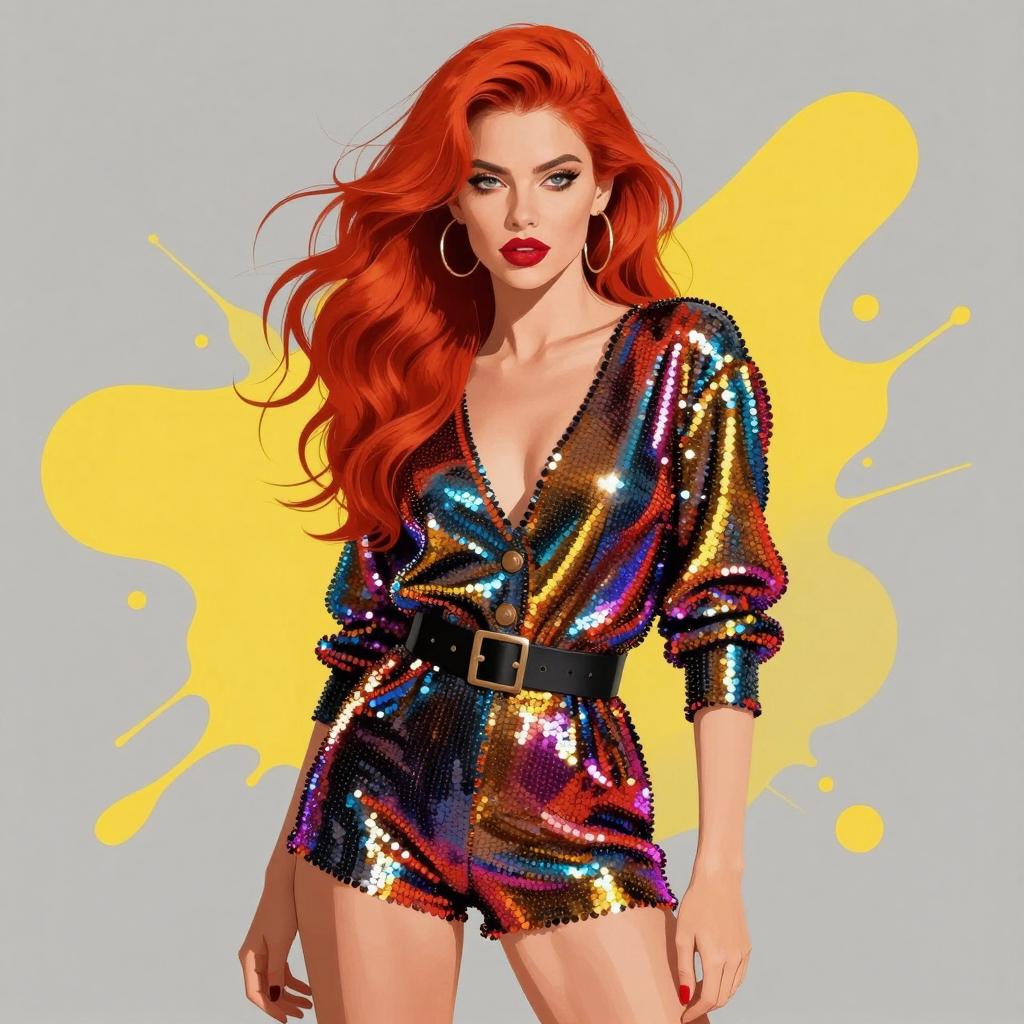 Digital illustration of a confident woman with long, vibrant red hair wearing a sparkling multicolored sequined romper cinched with a black belt. She has bold makeup featuring red lipstick and winged eyeliner, accessorized with large hoop earrings. The background includes modern abstract yellow and gray paint splashes, emphasizing the energetic and contemporary style.
