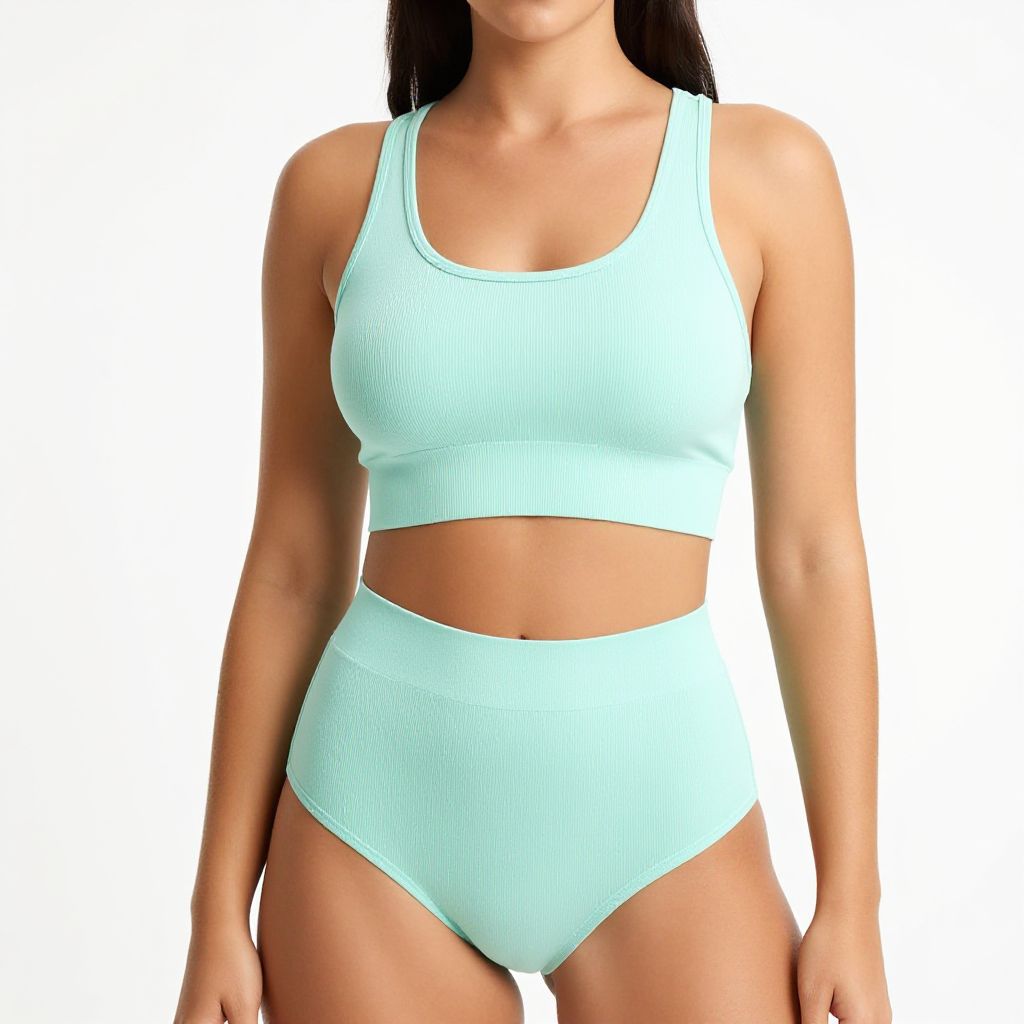 "Woman, minimalist sporty, mint green ribbed knit sports bra, scoop neckline, racerback style, matching high-waisted bikini-cut briefs, simple design, white studio background.. Sexy. Pretty face and beаutiful eyes. Big breasts."