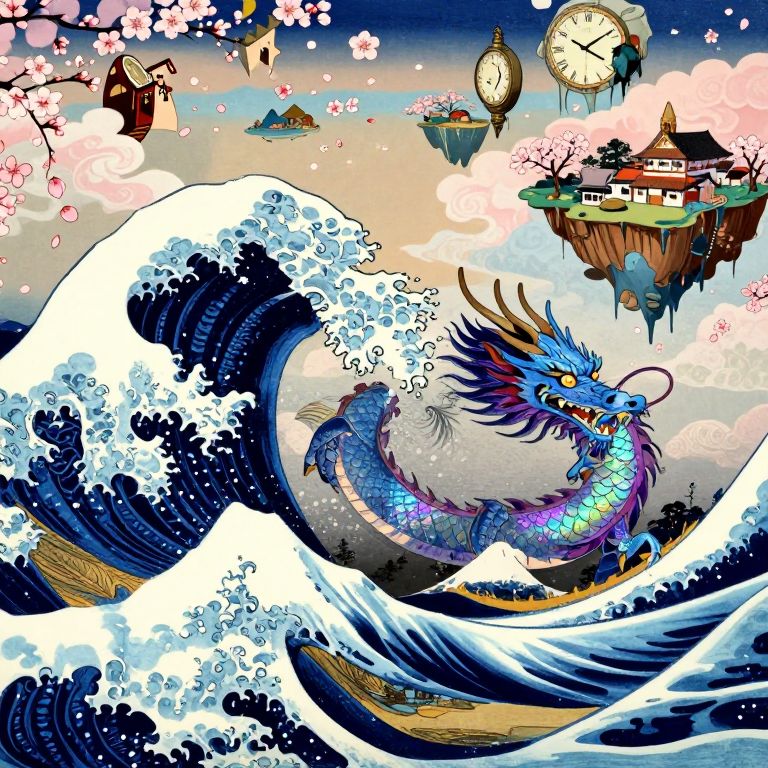 Craft an extraordinary digital art piece that masterfully blends surrealism with the dynamic energy of ukiyo-e woodblock prints, depicting a fantastical scene where a majestic dragon soars through a dreamlike landscape reminiscent of Hokusai's \"The Great Wave.\" As the dragon gracefully cuts through undulating waves, its form shimmers with iridescent scales that shift between deep blues and vibrant purples, while its eyes glow with an otherworldly light. The background features a tranquil Japanese village nestled beneath floating islands of clouds, where cherry blossoms dance in the wind like cotton candy swirls amidst a surreal sky filled with impossible architecture and melting clocks, embodying Dali's signature style. This scene should inspire both wonder and awe, capturing the essence of these two great art forms into one breathtaking image that challenges our perception of reality.