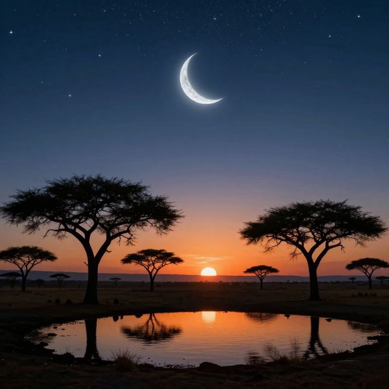 A digital artwork of a serene nighttime savanna scene. Silhouetted acacia trees stand around a reflective waterhole. The sky is a gradient from deep blue to orange, dotted with stars and a glowing crescent moon. The sun is setting just above the horizon, reflecting beautifully in the water. The overall vibe is peaceful and magical.