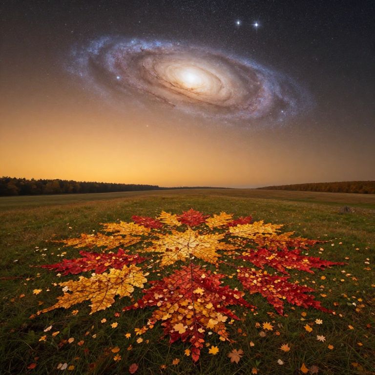 Imagine a peaceful landscape illuminated by the warm, golden hues of dusk as viewed from an aerial perspective, showcasing a serene meadow beneath a grand canopy of twinkling stars. Amidst this tranquil setting, a mosaic of fallen autumn leaves in rich shades of red and gold form intricate patterns that echo the celestial theme, blending nature's beauty with artistic flair. The scene seamlessly transitions from earth to sky as wispy clouds transform into mesmerizing galaxies swirling above, creating an emotional journey that harmoniously merges the serenity of nature with the vast enigmas of the cosmos.