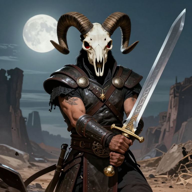 Concerto a warrior with a ram skull mask, red eyes, wearing warrior clothes, detailed, cool, spawn comics style, holding a broadsword, moon, beautiful colors, background wasteland,
