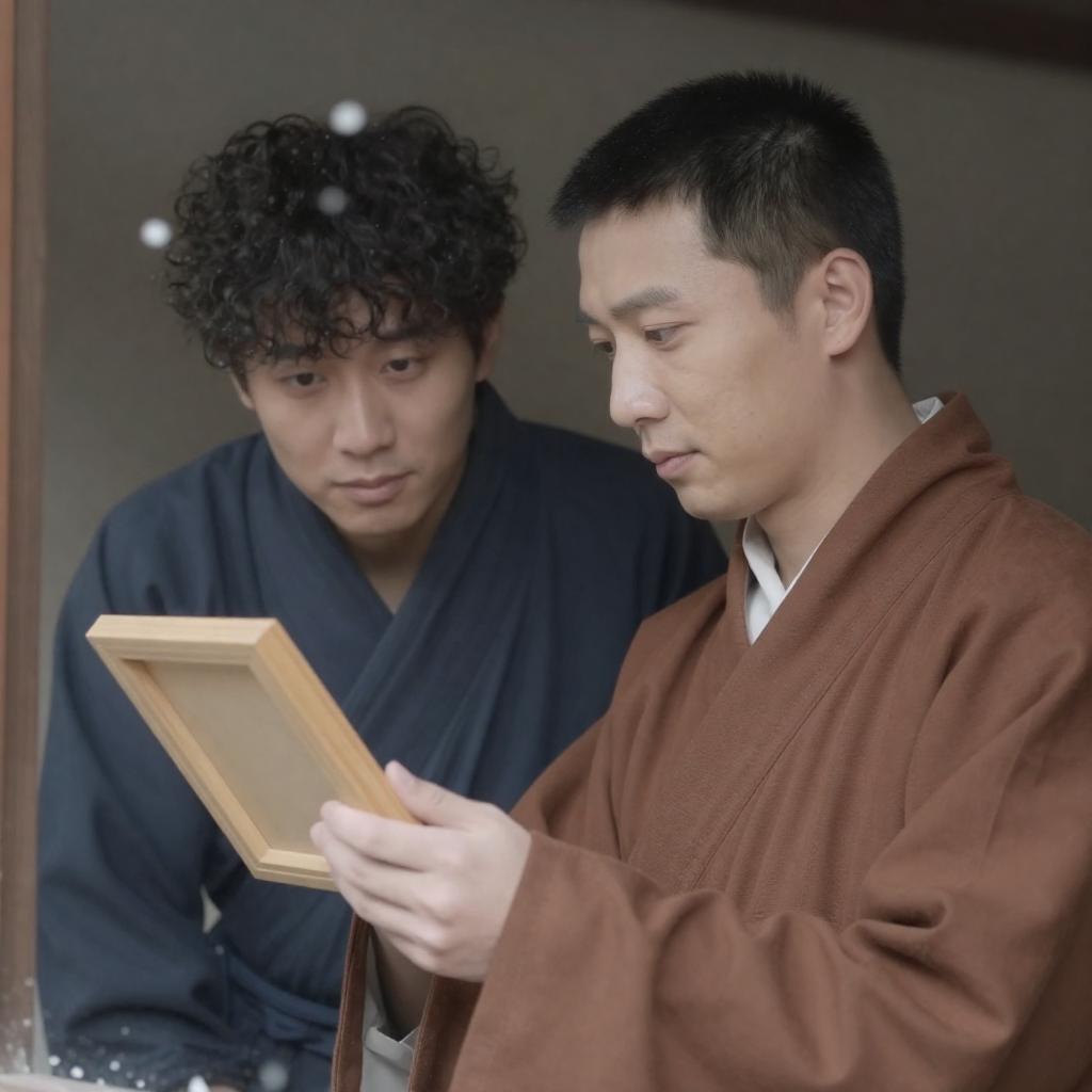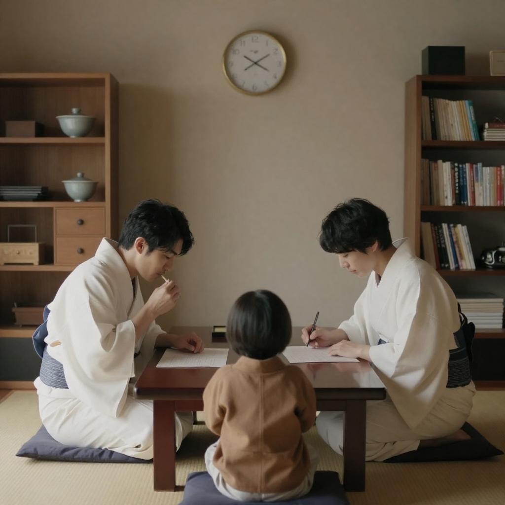 Traditional Japanese room. Three people, two adults, one child, sitting around a low table. Adults wear white kimonos, child in brown top. Adult left eats, adult right eats and writes. Clock on wall. Wooden shelves and drawers on left. Bookshelf on right. Child with short black hair. Soft lighting.
