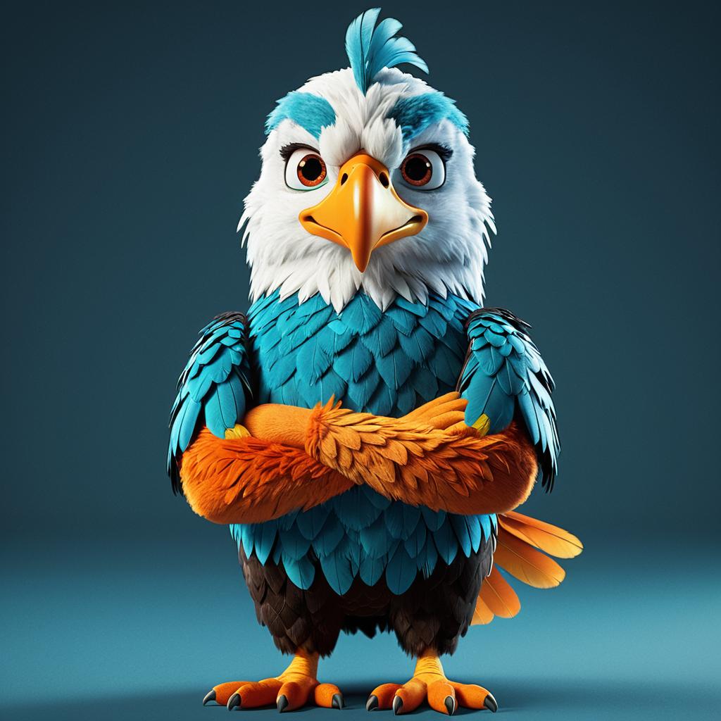 Disney Pixar character, 3D render style, eagle mascot with cyan feathers with orange tips, arms folded thoughtfully, humanoid, cinematic colors