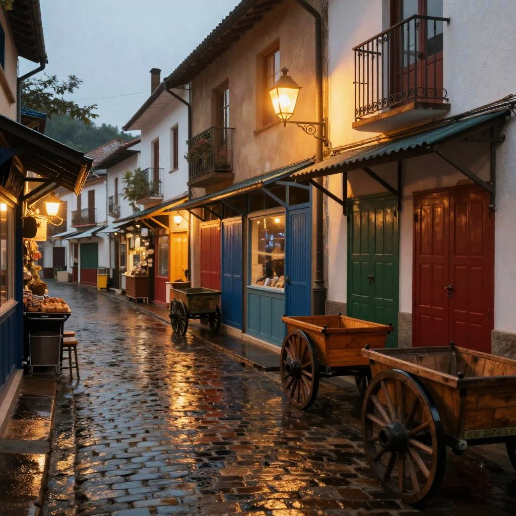 Cerrada charming closed market street in small town, early evening with warm lantern lights glowing, narrow alley lined with colorful closed stalls and empty wooden carts, cobblestone ground shining from recent rain, nostalgic and cozy mood in painterly style.