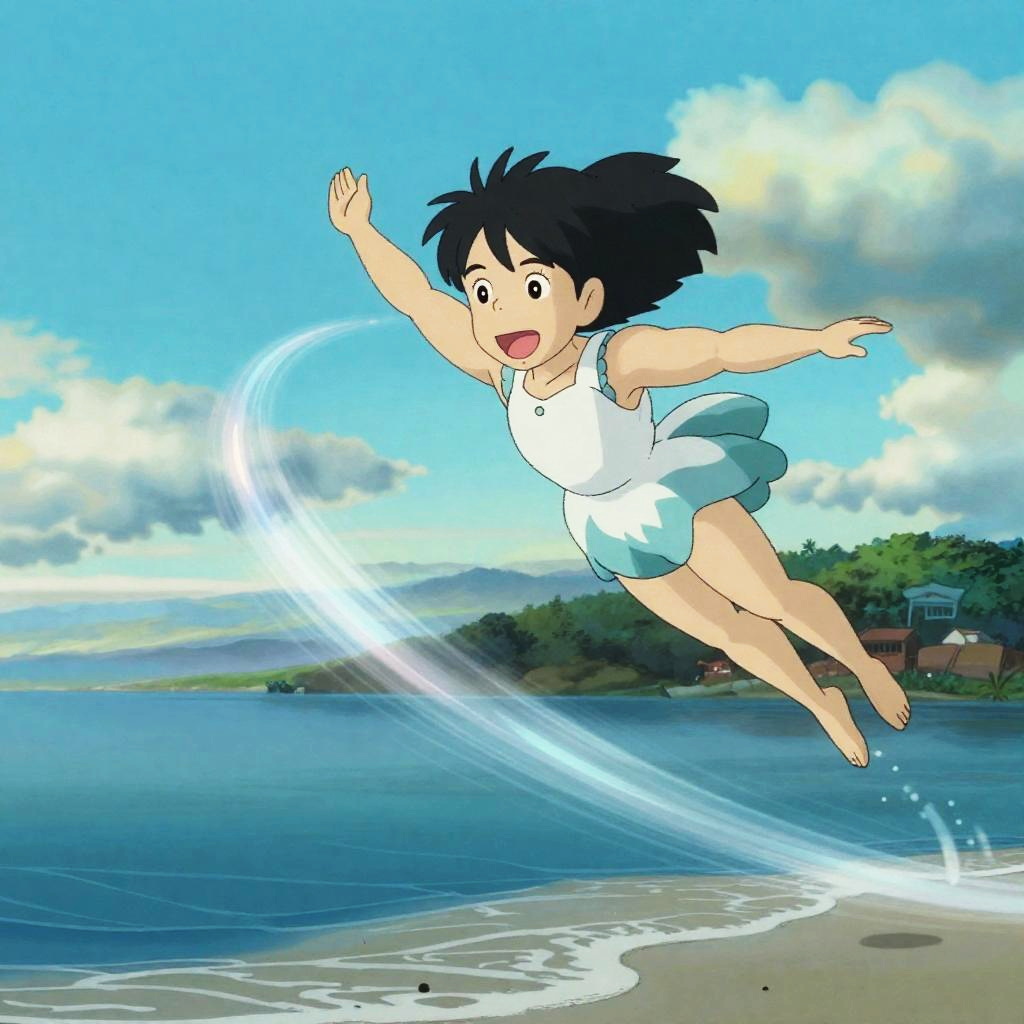 A vibrant emotional animation key shot of Joy riding a sparkling cloud scooter, in the style of Studio Ghibli, Disney concept art watercolor illustration by Alena Aenami, pastel color palette, bloom effect, dramatic lighting