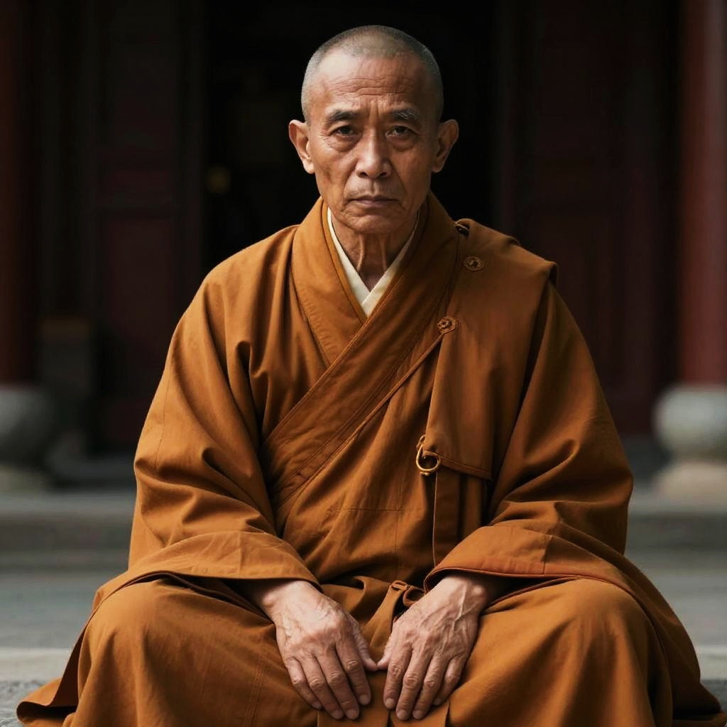 Half body photo of monk 52 y.o man, hands down, 8k uhd, high quality, dramatic, cinematic