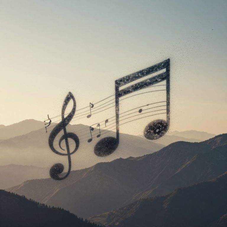 Mountains in the shape of musical notes crumble softly into the air, dissolving into melodic dust that lingers in the breeze as ambient harmony.