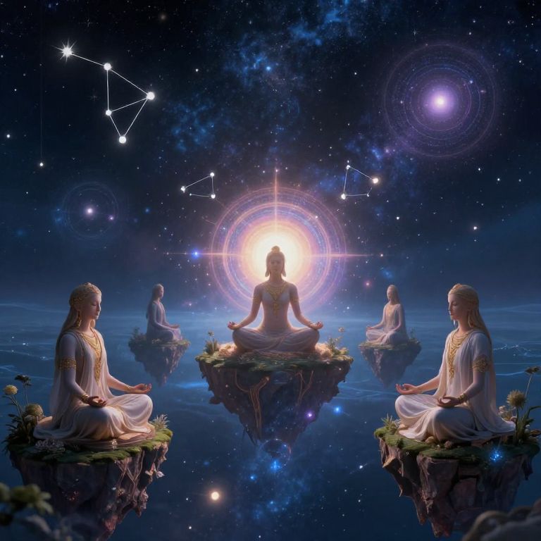 Astrally connected spiritual beings meditating atop floating islands in a vast cosmic ocean, illuminated by radiant orbs and celestial constellations, blending ancient mysticism with otherworldly astral realms.
