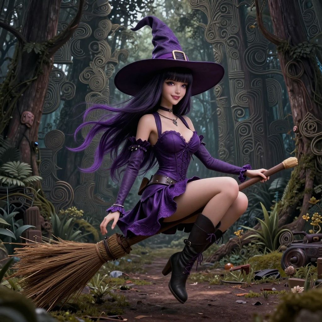 Ultra realistic 8k cg, masterpiece, ((ultra detailed background, delicate pattern, intricate detail)), (highly detailed, fine details), best quality, 1girl, beautiful lighting, absurdres, RAW photo, film grain, solo, hat, witch hat, witch, purple-black hair, dress, smile, purple clothing, beautiful detailed lips, ((small breasts, slim girl, broom, sitting on a broom, mid-air)), blunt bangs, forest environment, forest, complex detailed background, cowboy shot, morda