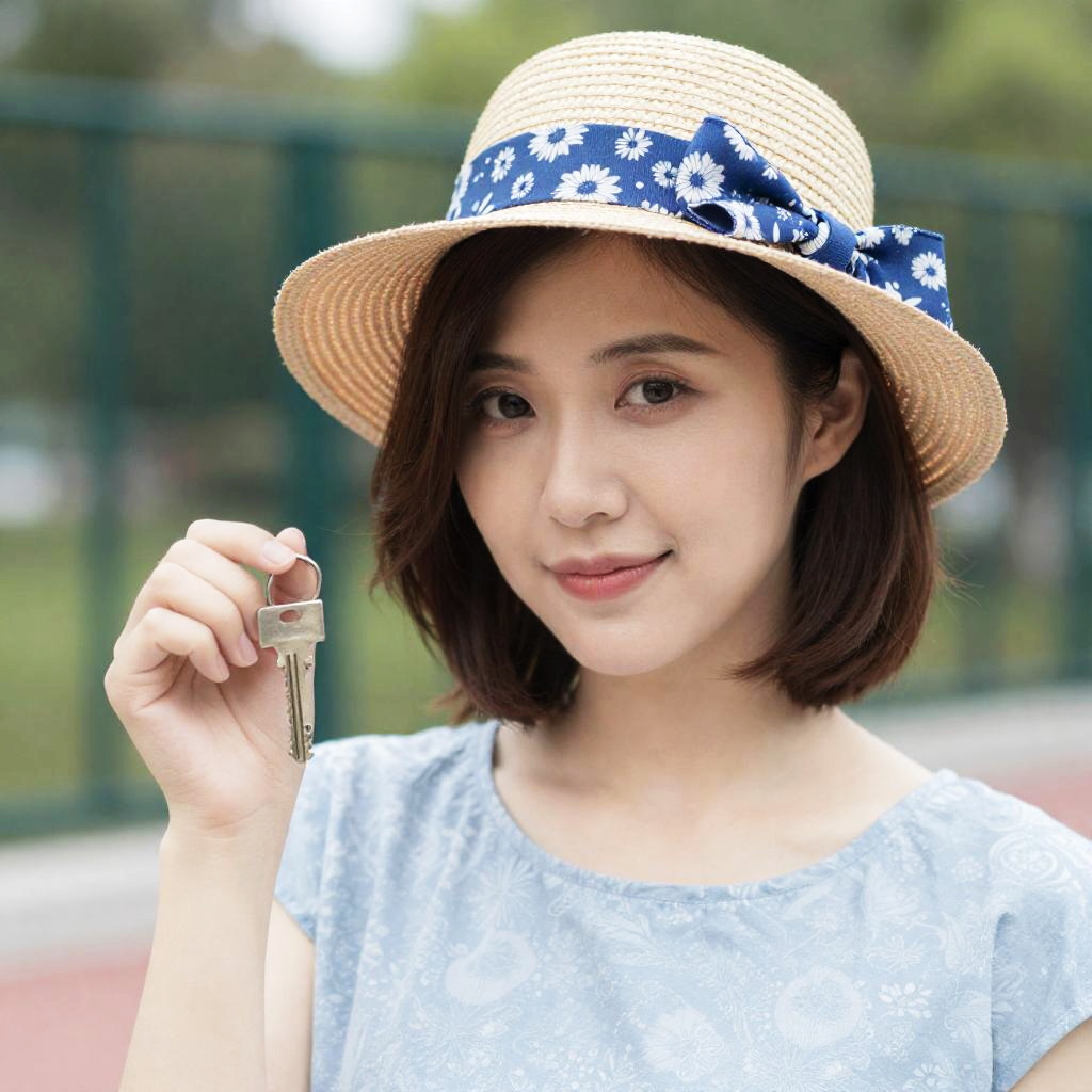 Photograph of a woman with short brown hair wearing a straw hat with a blue floral bow, holding a silver key in her right hand. She has light skin, subtle makeup, and a slight smile. Background includes green fencing and blurred foliage. She wears a light blue patterned dress.
